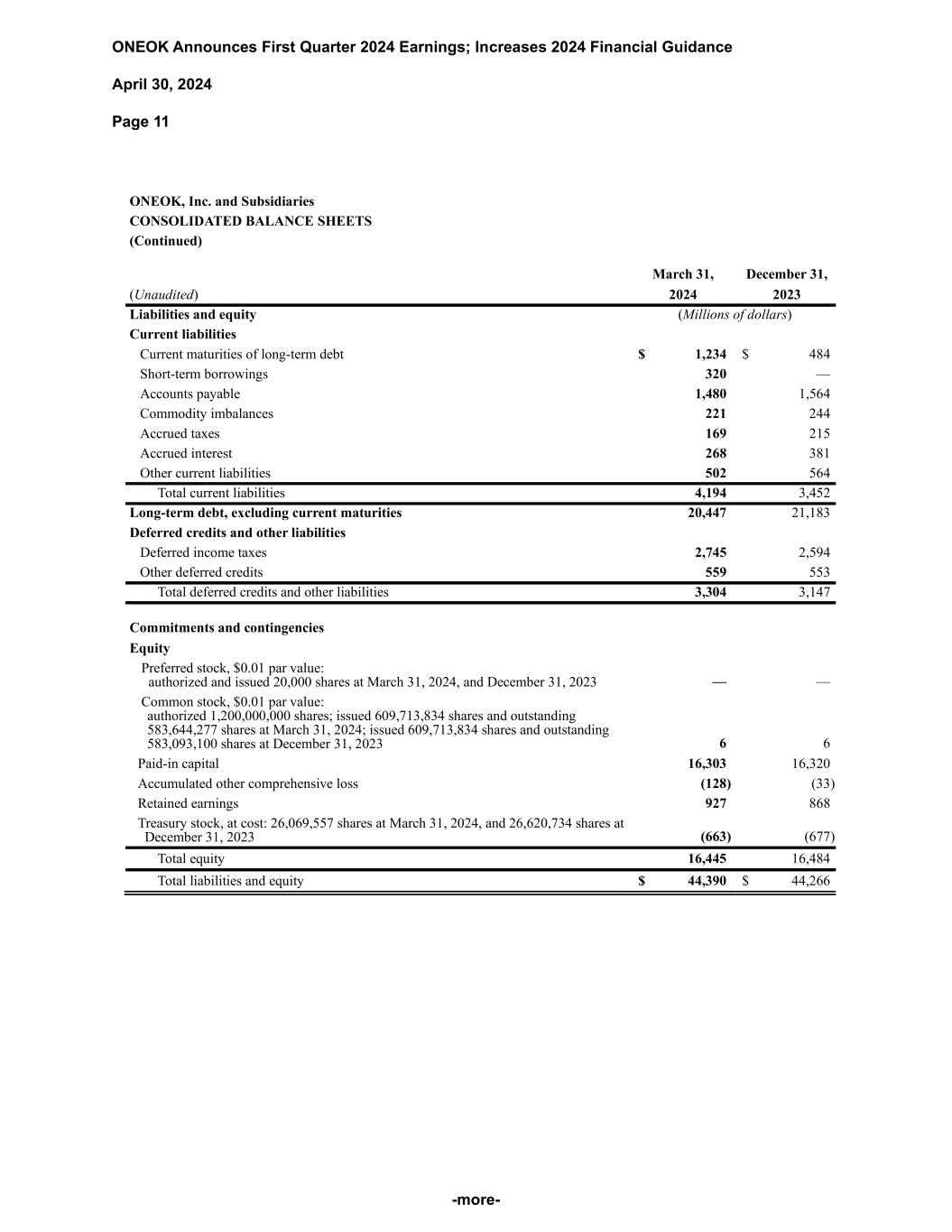 ONEOK Announces First Quarter 2024 Earnings; Increases 2024 Financial Guidance April 30, 2024 Page 11 -more- ONEOK, Inc. and Subsidiaries CONSOLIDATED BALANCE SHEETS (Continued) March 31, December 31, (Unaudited) 2024 2023 Liabilities and equity (Millions of dollars) Current liabilities Current maturities of long-term debt $ 1,234 $ 484 Short-term borrowings 320 — Accounts payable 1,480 1,564 Commodity imbalances 221 244 Accrued taxes 169 215 Accrued interest 268 381 Other current liabilities 502 564 Total current liabilities 4,194 3,452 Long-term debt, excluding current maturities 20,447 21,183 Deferred credits and other liabilities Deferred income taxes 2,745 2,594 Other deferred credits 559 553 Total deferred credits and other liabilities 3,304 3,147 Commitments and contingencies Equity Preferred stock, $0.01 par value: authorized and issued 20,000 shares at March 31, 2024, and December 31, 2023 — — Common stock, $0.01 par value: authorized 1,200,000,000 shares; issued 609,713,834 shares and outstanding 583,644,277 shares at March 31, 2024; issued 609,713,834 shares and outstanding 583,093,100 shares at December 31, 2023 6 6 Paid-in capital 16,303 16,320 Accumulated other comprehensive loss (128) (33) Retained earnings 927 868 Treasury stock, at cost: 26,069,557 shares at March 31, 2024, and 26,620,734 shares at December 31, 2023 (663) (677) Total equity 16,445 16,484 Total liabilities and equity $ 44,390 $ 44,266