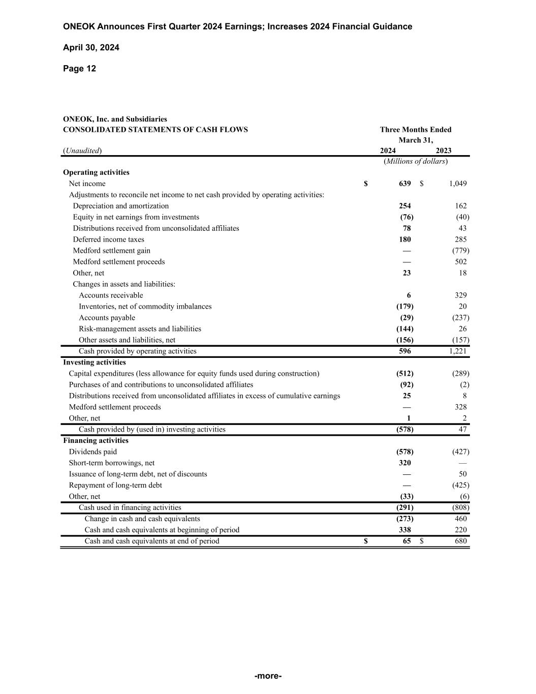 ONEOK Announces First Quarter 2024 Earnings; Increases 2024 Financial Guidance April 30, 2024 Page 12 -more- ONEOK, Inc. and Subsidiaries CONSOLIDATED STATEMENTS OF CASH FLOWS Three Months Ended March 31, (Unaudited) 2024 2023 (Millions of dollars) Operating activities Net income $ 639 $ 1,049 Adjustments to reconcile net income to net cash provided by operating activities: Depreciation and amortization 254 162 Equity in net earnings from investments (76) (40) Distributions received from unconsolidated affiliates 78 43 Deferred income taxes 180 285 Medford settlement gain — (779) Medford settlement proceeds — 502 Other, net 23 18 Changes in assets and liabilities: Accounts receivable 6 329 Inventories, net of commodity imbalances (179) 20 Accounts payable (29) (237) Risk-management assets and liabilities (144) 26 Other assets and liabilities, net (156) (157) Cash provided by operating activities 596 1,221 Investing activities Capital expenditures (less allowance for equity funds used during construction) (512) (289) Purchases of and contributions to unconsolidated affiliates (92) (2) Distributions received from unconsolidated affiliates in excess of cumulative earnings 25 8 Medford settlement proceeds — 328 Other, net 1 2 Cash provided by (used in) investing activities (578) 47 Financing activities Dividends paid (578) (427) Short-term borrowings, net 320 — Issuance of long-term debt, net of discounts — 50 Repayment of long-term debt — (425) Other, net (33) (6) Cash used in financing activities (291) (808) Change in cash and cash equivalents (273) 460 Cash and cash equivalents at beginning of period 338 220 Cash and cash equivalents at end of period $ 65 $ 680