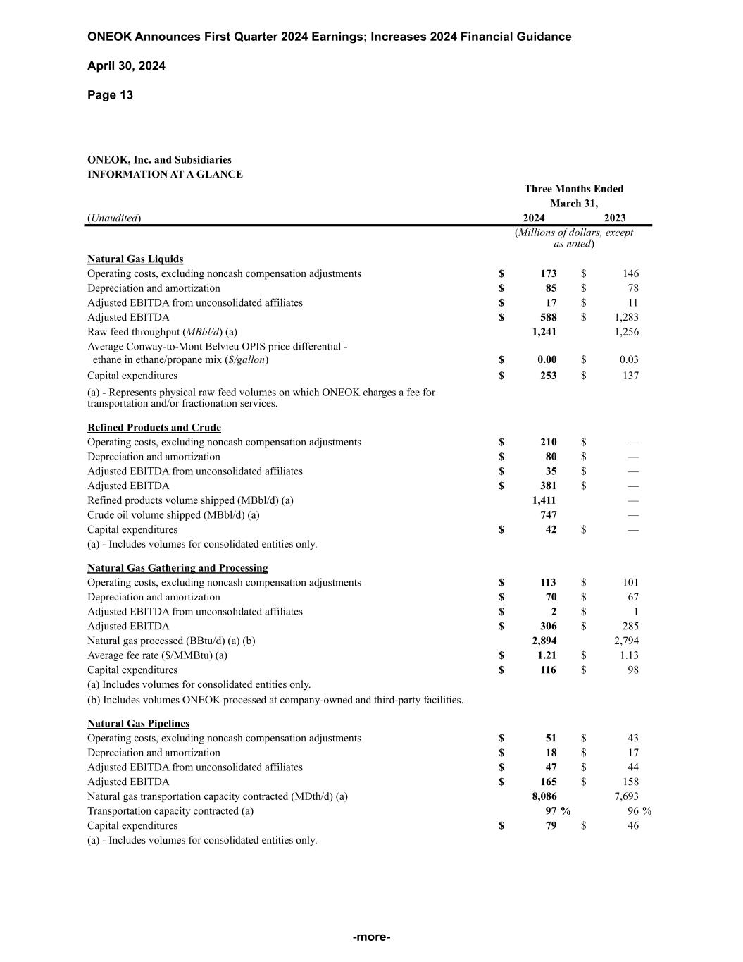 ONEOK Announces First Quarter 2024 Earnings; Increases 2024 Financial Guidance April 30, 2024 Page 13 -more- ONEOK, Inc. and Subsidiaries INFORMATION AT A GLANCE Three Months Ended March 31, (Unaudited) 2024 2023 (Millions of dollars, except as noted) Natural Gas Liquids Operating costs, excluding noncash compensation adjustments $ 173 $ 146 Depreciation and amortization $ 85 $ 78 Adjusted EBITDA from unconsolidated affiliates $ 17 $ 11 Adjusted EBITDA $ 588 $ 1,283 Raw feed throughput (MBbl/d) (a) 1,241 1,256 Average Conway-to-Mont Belvieu OPIS price differential - ethane in ethane/propane mix ($/gallon) $ 0.00 $ 0.03 Capital expenditures $ 253 $ 137 (a) - Represents physical raw feed volumes on which ONEOK charges a fee for transportation and/or fractionation services. Refined Products and Crude Operating costs, excluding noncash compensation adjustments $ 210 $ — Depreciation and amortization $ 80 $ — Adjusted EBITDA from unconsolidated affiliates $ 35 $ — Adjusted EBITDA $ 381 $ — Refined products volume shipped (MBbl/d) (a) 1,411 — Crude oil volume shipped (MBbl/d) (a) 747 — Capital expenditures $ 42 $ — (a) - Includes volumes for consolidated entities only. Natural Gas Gathering and Processing Operating costs, excluding noncash compensation adjustments $ 113 $ 101 Depreciation and amortization $ 70 $ 67 Adjusted EBITDA from unconsolidated affiliates $ 2 $ 1 Adjusted EBITDA $ 306 $ 285 Natural gas processed (BBtu/d) (a) (b) 2,894 2,794 Average fee rate ($/MMBtu) (a) $ 1.21 $ 1.13 Capital expenditures $ 116 $ 98 (a) Includes volumes for consolidated entities only. (b) Includes volumes ONEOK processed at company-owned and third-party facilities. Natural Gas Pipelines Operating costs, excluding noncash compensation adjustments $ 51 $ 43 Depreciation and amortization $ 18 $ 17 Adjusted EBITDA from unconsolidated affiliates $ 47 $ 44 Adjusted EBITDA $ 165 $ 158 Natural gas transportation capacity contracted (MDth/d) (a) 8,086 7,693 Transportation capacity contracted (a) 97 % 96 % Capital expenditures $ 79 $ 46 (a) - Includes volumes for consolidated entities only.