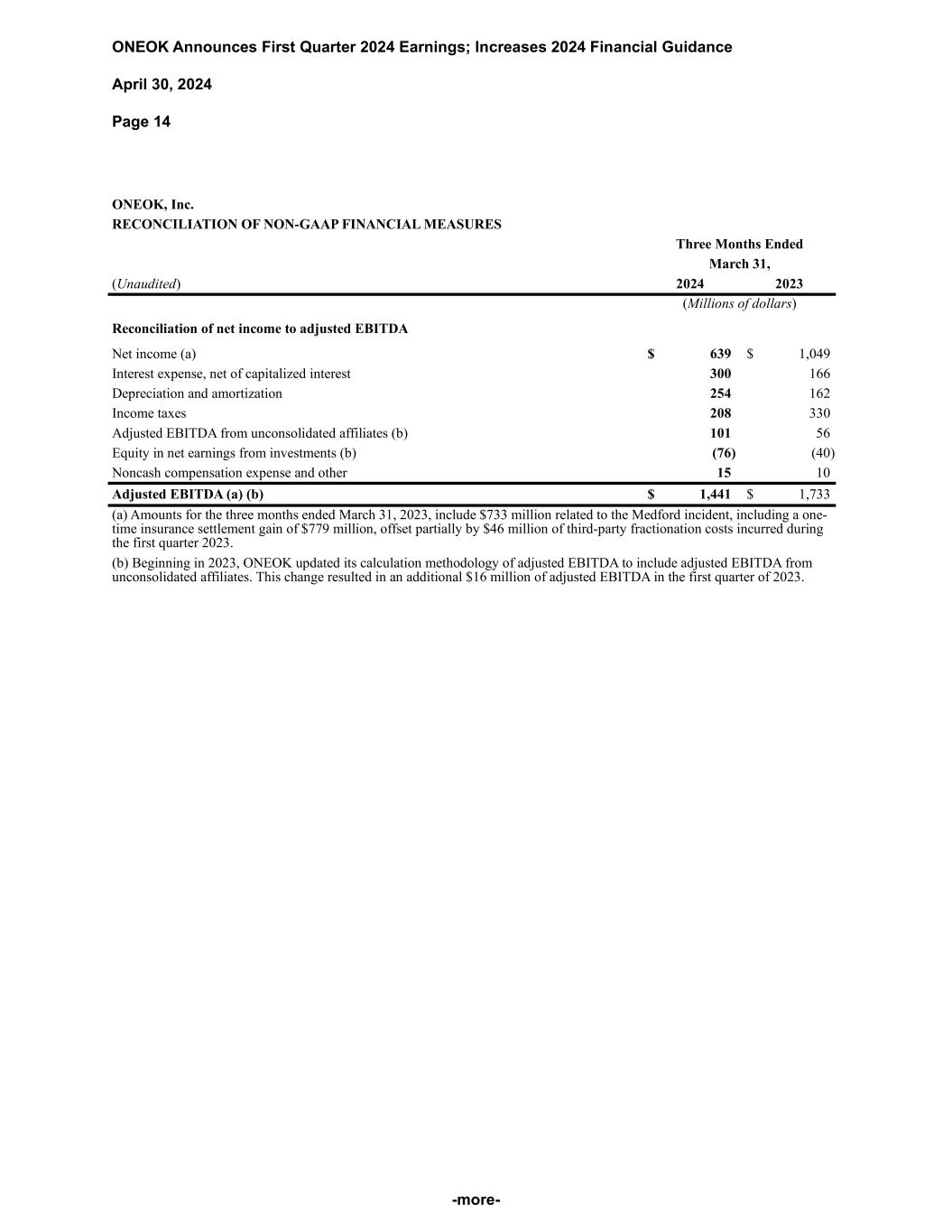 ONEOK Announces First Quarter 2024 Earnings; Increases 2024 Financial Guidance April 30, 2024 Page 14 -more- ONEOK, Inc. RECONCILIATION OF NON-GAAP FINANCIAL MEASURES Three Months Ended March 31, (Unaudited) 2024 2023 (Millions of dollars) Reconciliation of net income to adjusted EBITDA Net income (a) $ 639 $ 1,049 Interest expense, net of capitalized interest 300 166 Depreciation and amortization 254 162 Income taxes 208 330 Adjusted EBITDA from unconsolidated affiliates (b) 101 56 Equity in net earnings from investments (b) (76) (40) Noncash compensation expense and other 15 10 Adjusted EBITDA (a) (b) $ 1,441 $ 1,733 (a) Amounts for the three months ended March 31, 2023, include $733 million related to the Medford incident, including a one- time insurance settlement gain of $779 million, offset partially by $46 million of third-party fractionation costs incurred during the first quarter 2023. (b) Beginning in 2023, ONEOK updated its calculation methodology of adjusted EBITDA to include adjusted EBITDA from unconsolidated affiliates. This change resulted in an additional $16 million of adjusted EBITDA in the first quarter of 2023.