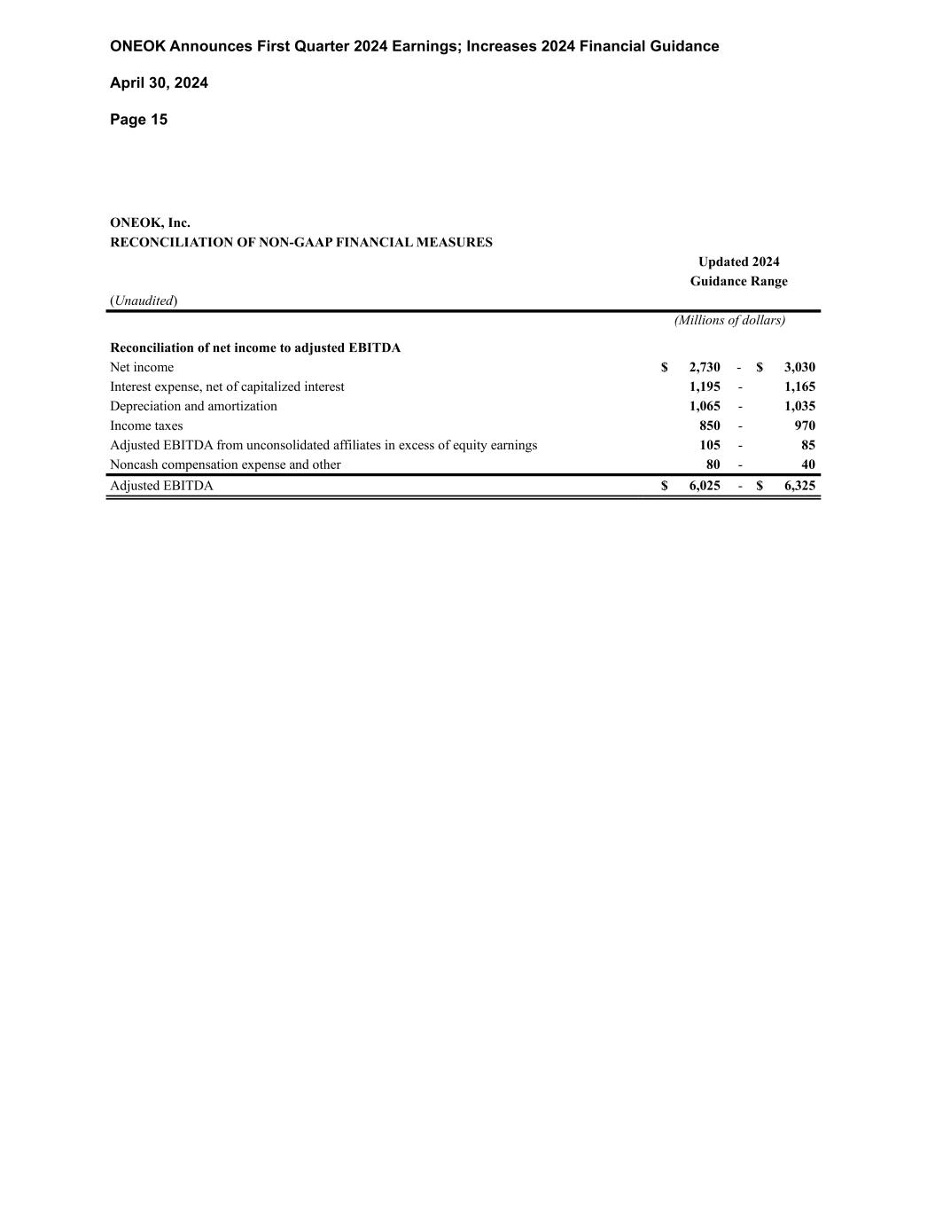 ONEOK Announces First Quarter 2024 Earnings; Increases 2024 Financial Guidance April 30, 2024 Page 15 ONEOK, Inc. RECONCILIATION OF NON-GAAP FINANCIAL MEASURES Updated 2024 Guidance Range (Unaudited) (Millions of dollars) Reconciliation of net income to adjusted EBITDA Net income $ 2,730 - $ 3,030 Interest expense, net of capitalized interest 1,195 - 1,165 Depreciation and amortization 1,065 - 1,035 Income taxes 850 - 970 Adjusted EBITDA from unconsolidated affiliates in excess of equity earnings 105 - 85 Noncash compensation expense and other 80 - 40 Adjusted EBITDA $ 6,025 - $ 6,325
