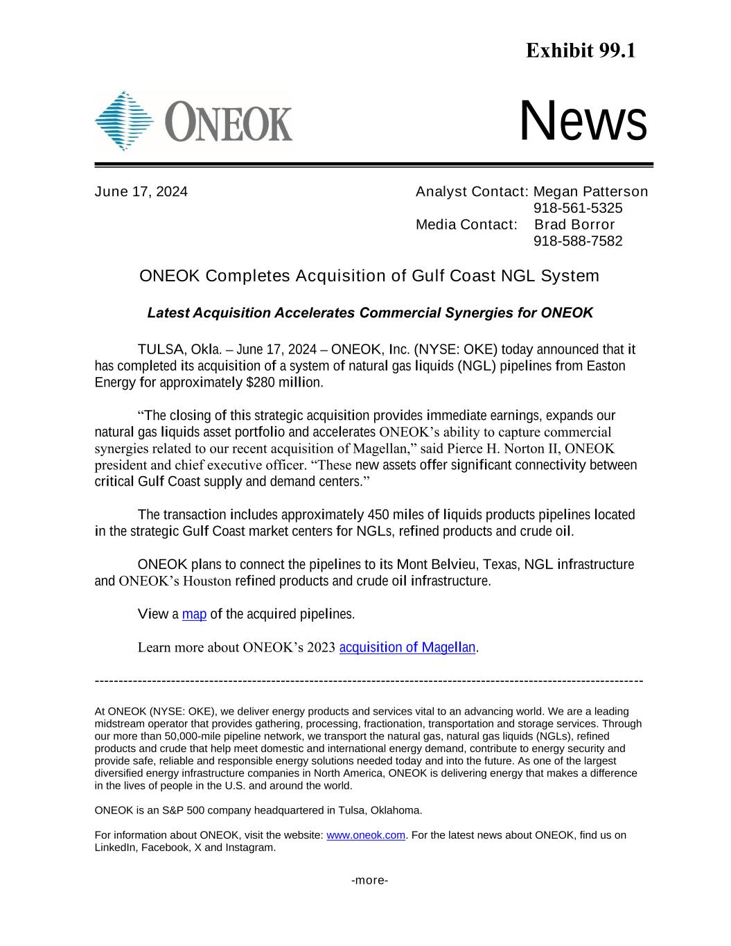 -more- News ONEOK Completes Acquisition of Gulf Coast NGL System Latest Acquisition Accelerates Commercial Synergies for ONEOK TULSA, Okla. – June 17, 2024 – ONEOK, Inc. (NYSE: OKE) today announced that it has completed its acquisition of a system of natural gas liquids (NGL) pipelines from Easton Energy for approximately $280 million. “The closing of this strategic acquisition provides immediate earnings, expands our natural gas liquids asset portfolio and accelerates ONEOK’s ability to capture commercial synergies related to our recent acquisition of Magellan,” said Pierce H. Norton II, ONEOK president and chief executive officer. “These new assets offer significant connectivity between critical Gulf Coast supply and demand centers.” The transaction includes approximately 450 miles of liquids products pipelines located in the strategic Gulf Coast market centers for NGLs, refined products and crude oil. ONEOK plans to connect the pipelines to its Mont Belvieu, Texas, NGL infrastructure and ONEOK’s Houston refined products and crude oil infrastructure. View a map of the acquired pipelines. Learn more about ONEOK’s 2023 acquisition of Magellan. ------------------------------------------------------------------------------------------------------------------- At ONEOK (NYSE: OKE), we deliver energy products and services vital to an advancing world. We are a leading midstream operator that provides gathering, processing, fractionation, transportation and storage services. Through our more than 50,000-mile pipeline network, we transport the natural gas, natural gas liquids (NGLs), refined products and crude that help meet domestic and international energy demand, contribute to energy security and provide safe, reliable and responsible energy solutions needed today and into the future. As one of the largest diversified energy infrastructure companies in North America, ONEOK is delivering energy that makes a difference in the lives of people in the U.S. and around the world. ONEOK is an S&P 500 company headquartered in Tulsa, Oklahoma. For information about ONEOK, visit the website: www.oneok.com. For the latest news about ONEOK, find us on LinkedIn, Facebook, X and Instagram. June 17, 2024 Analyst Contact: Megan Patterson 918-561-5325 Media Contact: Brad Borror 918-588-7582 Exhibit 99.1