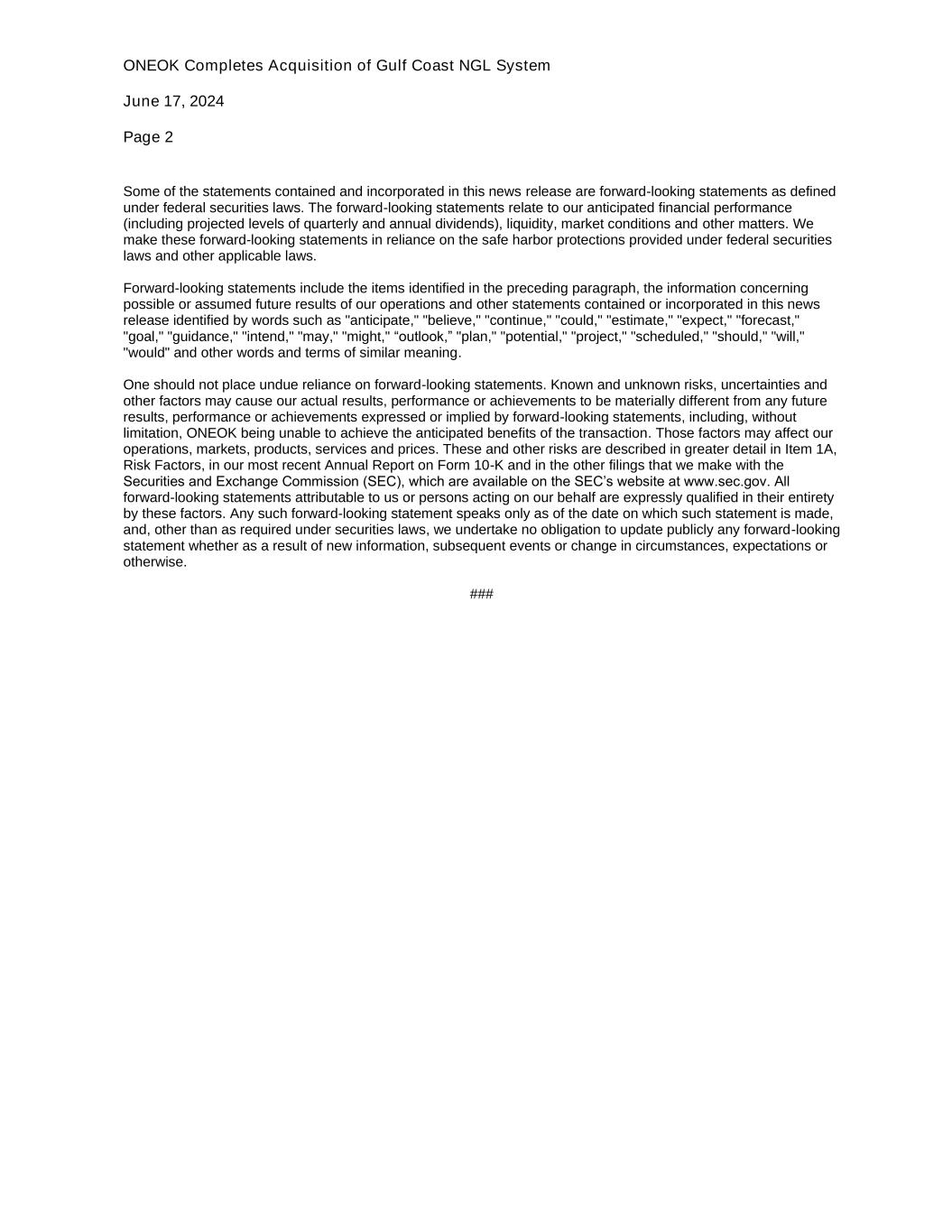 ONEOK Completes Acquisition of Gulf Coast NGL System June 17, 2024 Page 2 Some of the statements contained and incorporated in this news release are forward-looking statements as defined under federal securities laws. The forward-looking statements relate to our anticipated financial performance (including projected levels of quarterly and annual dividends), liquidity, market conditions and other matters. We make these forward-looking statements in reliance on the safe harbor protections provided under federal securities laws and other applicable laws. Forward-looking statements include the items identified in the preceding paragraph, the information concerning possible or assumed future results of our operations and other statements contained or incorporated in this news release identified by words such as "anticipate," "believe," "continue," "could," "estimate," "expect," "forecast," "goal," "guidance," "intend," "may," "might," “outlook,” "plan," "potential," "project," "scheduled," "should," "will," "would" and other words and terms of similar meaning. One should not place undue reliance on forward-looking statements. Known and unknown risks, uncertainties and other factors may cause our actual results, performance or achievements to be materially different from any future results, performance or achievements expressed or implied by forward-looking statements, including, without limitation, ONEOK being unable to achieve the anticipated benefits of the transaction. Those factors may affect our operations, markets, products, services and prices. These and other risks are described in greater detail in Item 1A, Risk Factors, in our most recent Annual Report on Form 10-K and in the other filings that we make with the Securities and Exchange Commission (SEC), which are available on the SEC’s website at www.sec.gov. All forward-looking statements attributable to us or persons acting on our behalf are expressly qualified in their entirety by these factors. Any such forward-looking statement speaks only as of the date on which such statement is made, and, other than as required under securities laws, we undertake no obligation to update publicly any forward-looking statement whether as a result of new information, subsequent events or change in circumstances, expectations or otherwise. ###