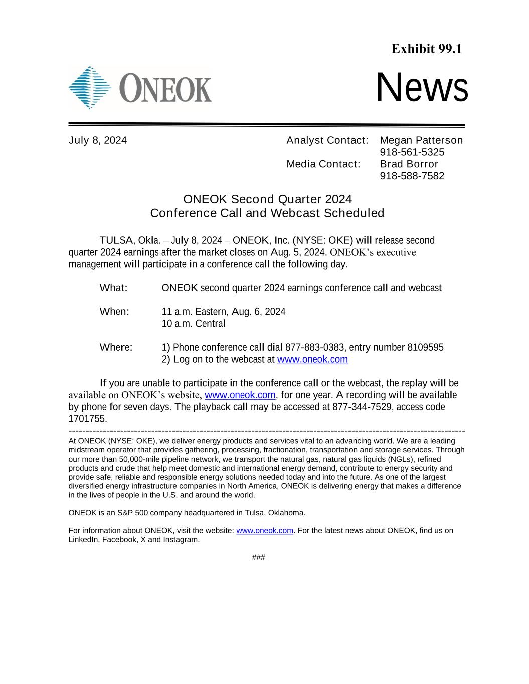 News ONEOK Second Quarter 2024 Conference Call and Webcast Scheduled TULSA, Okla. – July 8, 2024 – ONEOK, Inc. (NYSE: OKE) will release second quarter 2024 earnings after the market closes on Aug. 5, 2024. ONEOK’s executive management will participate in a conference call the following day. What: ONEOK second quarter 2024 earnings conference call and webcast When: 11 a.m. Eastern, Aug. 6, 2024 10 a.m. Central Where: 1) Phone conference call dial 877-883-0383, entry number 8109595 2) Log on to the webcast at www.oneok.com If you are unable to participate in the conference call or the webcast, the replay will be available on ONEOK’s website, www.oneok.com, for one year. A recording will be available by phone for seven days. The playback call may be accessed at 877-344-7529, access code 1701755. ------------------------------------------------------------------------------------------------------------------- At ONEOK (NYSE: OKE), we deliver energy products and services vital to an advancing world. We are a leading midstream operator that provides gathering, processing, fractionation, transportation and storage services. Through our more than 50,000-mile pipeline network, we transport the natural gas, natural gas liquids (NGLs), refined products and crude that help meet domestic and international energy demand, contribute to energy security and provide safe, reliable and responsible energy solutions needed today and into the future. As one of the largest diversified energy infrastructure companies in North America, ONEOK is delivering energy that makes a difference in the lives of people in the U.S. and around the world. ONEOK is an S&P 500 company headquartered in Tulsa, Oklahoma. For information about ONEOK, visit the website: www.oneok.com. For the latest news about ONEOK, find us on LinkedIn, Facebook, X and Instagram. ### July 8, 2024 Analyst Contact: Megan Patterson 918-561-5325 Media Contact: Brad Borror 918-588-7582 Exhibit 99.1