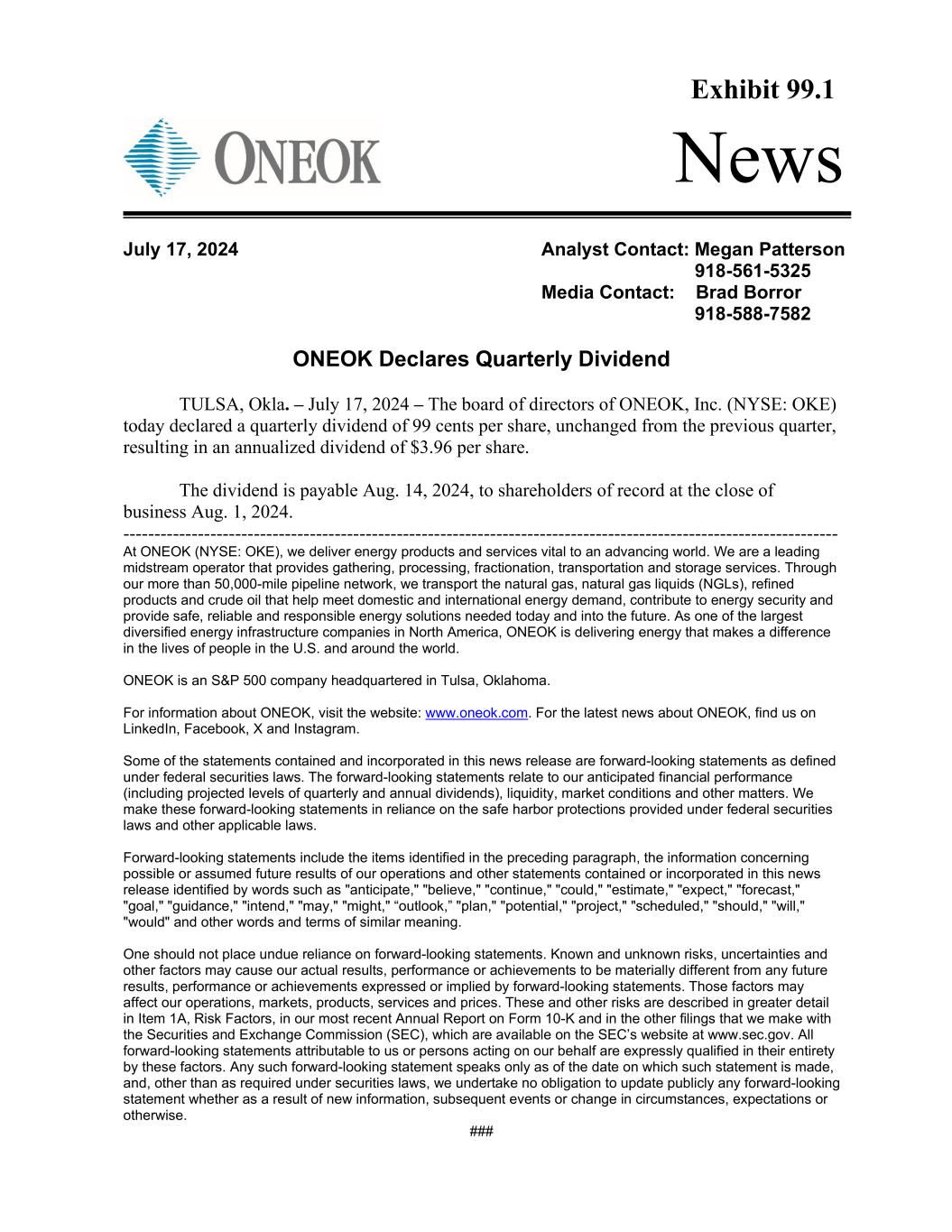 News ONEOK Declares Quarterly Dividend TULSA, Okla. – July 17, 2024 – The board of directors of ONEOK, Inc. (NYSE: OKE) today declared a quarterly dividend of 99 cents per share, unchanged from the previous quarter, resulting in an annualized dividend of $3.96 per share. The dividend is payable Aug. 14, 2024, to shareholders of record at the close of business Aug. 1, 2024. ------------------------------------------------------------------------------------------------------------------- At ONEOK (NYSE: OKE), we deliver energy products and services vital to an advancing world. We are a leading midstream operator that provides gathering, processing, fractionation, transportation and storage services. Through our more than 50,000-mile pipeline network, we transport the natural gas, natural gas liquids (NGLs), refined products and crude oil that help meet domestic and international energy demand, contribute to energy security and provide safe, reliable and responsible energy solutions needed today and into the future. As one of the largest diversified energy infrastructure companies in North America, ONEOK is delivering energy that makes a difference in the lives of people in the U.S. and around the world. ONEOK is an S&P 500 company headquartered in Tulsa, Oklahoma. For information about ONEOK, visit the website: www.oneok.com. For the latest news about ONEOK, find us on LinkedIn, Facebook, X and Instagram. Some of the statements contained and incorporated in this news release are forward-looking statements as defined under federal securities laws. The forward-looking statements relate to our anticipated financial performance (including projected levels of quarterly and annual dividends), liquidity, market conditions and other matters. We make these forward-looking statements in reliance on the safe harbor protections provided under federal securities laws and other applicable laws. Forward-looking statements include the items identified in the preceding paragraph, the information concerning possible or assumed future results of our operations and other statements contained or incorporated in this news release identified by words such as "anticipate," "believe," "continue," "could," "estimate," "expect," "forecast," "goal," "guidance," "intend," "may," "might," “outlook,” "plan," "potential," "project," "scheduled," "should," "will," "would" and other words and terms of similar meaning. One should not place undue reliance on forward-looking statements. Known and unknown risks, uncertainties and other factors may cause our actual results, performance or achievements to be materially different from any future results, performance or achievements expressed or implied by forward-looking statements. Those factors may affect our operations, markets, products, services and prices. These and other risks are described in greater detail in Item 1A, Risk Factors, in our most recent Annual Report on Form 10-K and in the other filings that we make with the Securities and Exchange Commission (SEC), which are available on the SEC’s website at www.sec.gov. All forward-looking statements attributable to us or persons acting on our behalf are expressly qualified in their entirety by these factors. Any such forward-looking statement speaks only as of the date on which such statement is made, and, other than as required under securities laws, we undertake no obligation to update publicly any forward-looking statement whether as a result of new information, subsequent events or change in circumstances, expectations or otherwise. ### July 17, 2024 Analyst Contact: Megan Patterson 918-561-5325 Media Contact: Brad Borror 918-588-7582 Exhibit 99.1