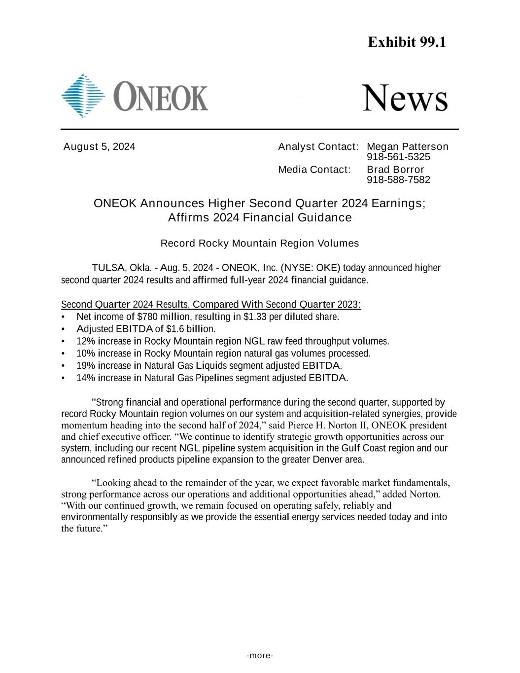 -more- August 5, 2024 Analyst Contact: Megan Patterson 918-561-5325 Media Contact: Brad Borror 918-588-7582 ONEOK Announces Higher Second Quarter 2024 Earnings; Affirms 2024 Financial Guidance Record Rocky Mountain Region Volumes TULSA, Okla. - Aug. 5, 2024 - ONEOK, Inc. (NYSE: OKE) today announced higher second quarter 2024 results and affirmed full-year 2024 financial guidance. Second Quarter 2024 Results, Compared With Second Quarter 2023: • Net income of $780 million, resulting in $1.33 per diluted share. • Adjusted EBITDA of $1.6 billion. • 12% increase in Rocky Mountain region NGL raw feed throughput volumes. • 10% increase in Rocky Mountain region natural gas volumes processed. • 19% increase in Natural Gas Liquids segment adjusted EBITDA. • 14% increase in Natural Gas Pipelines segment adjusted EBITDA. "Strong financial and operational performance during the second quarter, supported by record Rocky Mountain region volumes on our system and acquisition-related synergies, provide momentum heading into the second half of 2024,” said Pierce H. Norton II, ONEOK president and chief executive officer. “We continue to identify strategic growth opportunities across our system, including our recent NGL pipeline system acquisition in the Gulf Coast region and our announced refined products pipeline expansion to the greater Denver area. “Looking ahead to the remainder of the year, we expect favorable market fundamentals, strong performance across our operations and additional opportunities ahead,” added Norton. “With our continued growth, we remain focused on operating safely, reliably and environmentally responsibly as we provide the essential energy services needed today and into the future.” Exhibit 99.1