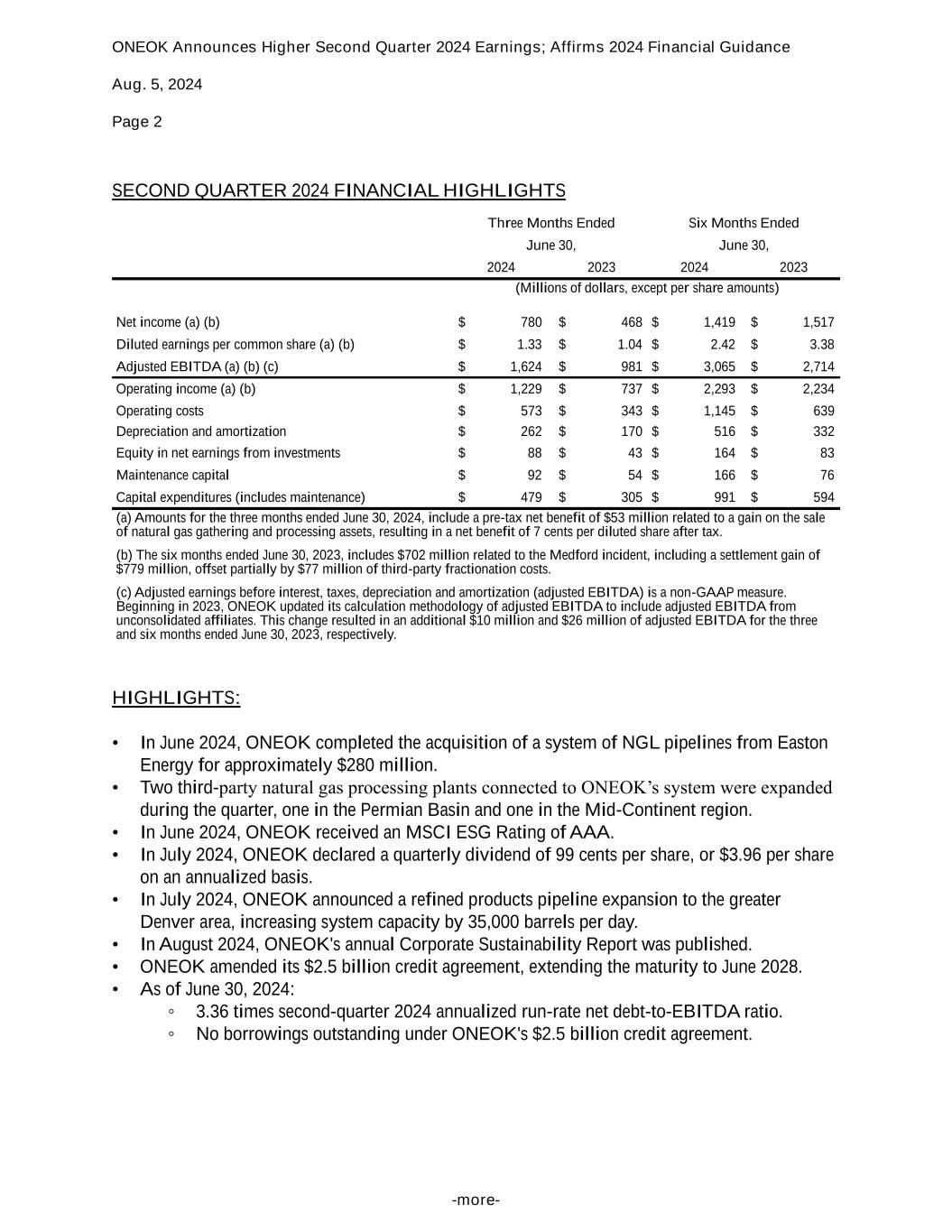 ONEOK Announces Higher Second Quarter 2024 Earnings; Affirms 2024 Financial Guidance Aug. 5, 2024 Page 2 -more- SECOND QUARTER 2024 FINANCIAL HIGHLIGHTS Three Months Ended Six Months Ended June 30, June 30, 2024 2023 2024 2023 (Millions of dollars, except per share amounts) Net income (a) (b) $ 780 $ 468 $ 1,419 $ 1,517 Diluted earnings per common share (a) (b) $ 1.33 $ 1.04 $ 2.42 $ 3.38 Adjusted EBITDA (a) (b) (c) $ 1,624 $ 981 $ 3,065 $ 2,714 Operating income (a) (b) $ 1,229 $ 737 $ 2,293 $ 2,234 Operating costs $ 573 $ 343 $ 1,145 $ 639 Depreciation and amortization $ 262 $ 170 $ 516 $ 332 Equity in net earnings from investments $ 88 $ 43 $ 164 $ 83 Maintenance capital $ 92 $ 54 $ 166 $ 76 Capital expenditures (includes maintenance) $ 479 $ 305 $ 991 $ 594 (a) Amounts for the three months ended June 30, 2024, include a pre-tax net benefit of $53 million related to a gain on the sale of natural gas gathering and processing assets, resulting in a net benefit of 7 cents per diluted share after tax. (b) The six months ended June 30, 2023, includes $702 million related to the Medford incident, including a settlement gain of $779 million, offset partially by $77 million of third-party fractionation costs. (c) Adjusted earnings before interest, taxes, depreciation and amortization (adjusted EBITDA) is a non-GAAP measure. Beginning in 2023, ONEOK updated its calculation methodology of adjusted EBITDA to include adjusted EBITDA from unconsolidated affiliates. This change resulted in an additional $10 million and $26 million of adjusted EBITDA for the three and six months ended June 30, 2023, respectively. HIGHLIGHTS: • In June 2024, ONEOK completed the acquisition of a system of NGL pipelines from Easton Energy for approximately $280 million. • Two third-party natural gas processing plants connected to ONEOK’s system were expanded during the quarter, one in the Permian Basin and one in the Mid-Continent region. • In June 2024, ONEOK received an MSCI ESG Rating of AAA. • In July 2024, ONEOK declared a quarterly dividend of 99 cents per share, or $3.96 per share on an annualized basis. • In July 2024, ONEOK announced a refined products pipeline expansion to the greater Denver area, increasing system capacity by 35,000 barrels per day. • In August 2024, ONEOK's annual Corporate Sustainability Report was published. • ONEOK amended its $2.5 billion credit agreement, extending the maturity to June 2028. • As of June 30, 2024: ◦ 3.36 times second-quarter 2024 annualized run-rate net debt-to-EBITDA ratio. ◦ No borrowings outstanding under ONEOK's $2.5 billion credit agreement.