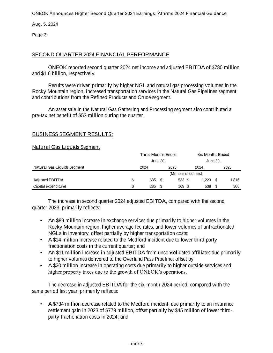 ONEOK Announces Higher Second Quarter 2024 Earnings; Affirms 2024 Financial Guidance Aug. 5, 2024 Page 3 -more- SECOND QUARTER 2024 FINANCIAL PERFORMANCE ONEOK reported second quarter 2024 net income and adjusted EBITDA of $780 million and $1.6 billion, respectively. Results were driven primarily by higher NGL and natural gas processing volumes in the Rocky Mountain region, increased transportation services in the Natural Gas Pipelines segment and contributions from the Refined Products and Crude segment. An asset sale in the Natural Gas Gathering and Processing segment also contributed a pre-tax net benefit of $53 million during the quarter. BUSINESS SEGMENT RESULTS: Natural Gas Liquids Segment Three Months Ended Six Months Ended June 30, June 30, Natural Gas Liquids Segment 2024 2023 2024 2023 (Millions of dollars) Adjusted EBITDA $ 635 $ 533 $ 1,223 $ 1,816 Capital expenditures $ 285 $ 169 $ 538 $ 306 The increase in second quarter 2024 adjusted EBITDA, compared with the second quarter 2023, primarily reflects: • An $89 million increase in exchange services due primarily to higher volumes in the Rocky Mountain region, higher average fee rates, and lower volumes of unfractionated NGLs in inventory, offset partially by higher transportation costs; • A $14 million increase related to the Medford incident due to lower third-party fractionation costs in the current quarter; and • An $11 million increase in adjusted EBITDA from unconsolidated affiliates due primarily to higher volumes delivered to the Overland Pass Pipeline; offset by • A $20 million increase in operating costs due primarily to higher outside services and higher property taxes due to the growth of ONEOK’s operations. The decrease in adjusted EBITDA for the six-month 2024 period, compared with the same period last year, primarily reflects: • A $734 million decrease related to the Medford incident, due primarily to an insurance settlement gain in 2023 of $779 million, offset partially by $45 million of lower third- party fractionation costs in 2024; and