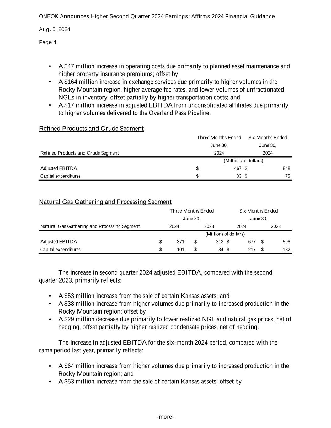 ONEOK Announces Higher Second Quarter 2024 Earnings; Affirms 2024 Financial Guidance Aug. 5, 2024 Page 4 -more- • A $47 million increase in operating costs due primarily to planned asset maintenance and higher property insurance premiums; offset by • A $164 million increase in exchange services due primarily to higher volumes in the Rocky Mountain region, higher average fee rates, and lower volumes of unfractionated NGLs in inventory, offset partially by higher transportation costs; and • A $17 million increase in adjusted EBITDA from unconsolidated affiliates due primarily to higher volumes delivered to the Overland Pass Pipeline. Refined Products and Crude Segment Three Months Ended Six Months Ended June 30, June 30, Refined Products and Crude Segment 2024 2024 (Millions of dollars) Adjusted EBITDA $ 467 $ 848 Capital expenditures $ 33 $ 75 Natural Gas Gathering and Processing Segment Three Months Ended Six Months Ended June 30, June 30, Natural Gas Gathering and Processing Segment 2024 2023 2024 2023 (Millions of dollars) Adjusted EBITDA $ 371 $ 313 $ 677 $ 598 Capital expenditures $ 101 $ 84 $ 217 $ 182 The increase in second quarter 2024 adjusted EBITDA, compared with the second quarter 2023, primarily reflects: • A $53 million increase from the sale of certain Kansas assets; and • A $38 million increase from higher volumes due primarily to increased production in the Rocky Mountain region; offset by • A $29 million decrease due primarily to lower realized NGL and natural gas prices, net of hedging, offset partially by higher realized condensate prices, net of hedging. The increase in adjusted EBITDA for the six-month 2024 period, compared with the same period last year, primarily reflects: • A $64 million increase from higher volumes due primarily to increased production in the Rocky Mountain region; and • A $53 million increase from the sale of certain Kansas assets; offset by