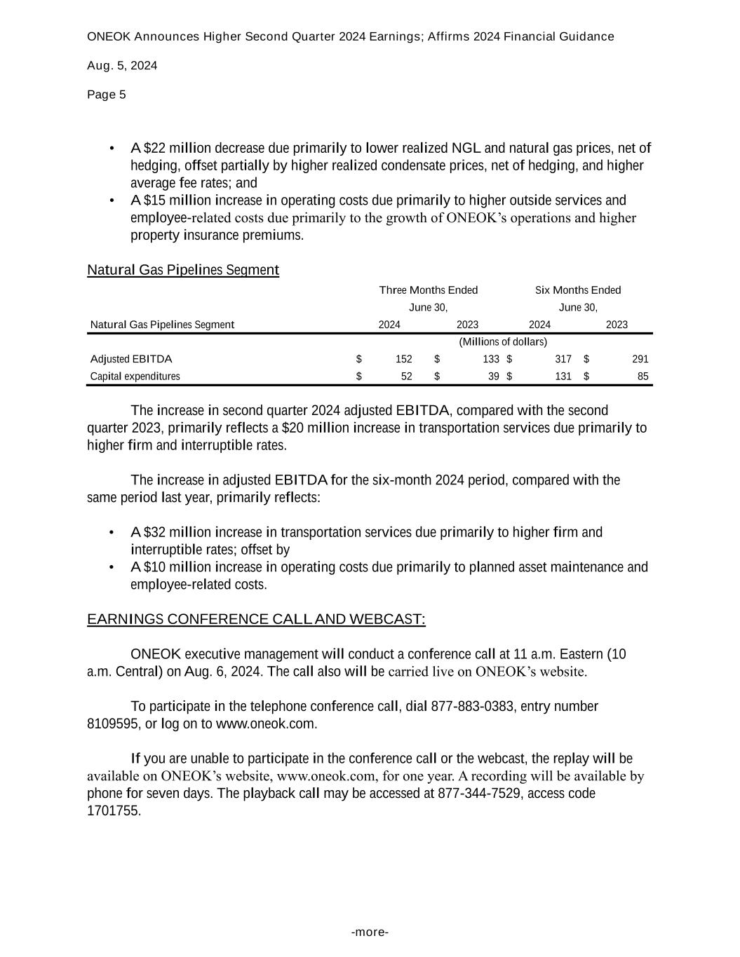 ONEOK Announces Higher Second Quarter 2024 Earnings; Affirms 2024 Financial Guidance Aug. 5, 2024 Page 5 -more- • A $22 million decrease due primarily to lower realized NGL and natural gas prices, net of hedging, offset partially by higher realized condensate prices, net of hedging, and higher average fee rates; and • A $15 million increase in operating costs due primarily to higher outside services and employee-related costs due primarily to the growth of ONEOK’s operations and higher property insurance premiums. Natural Gas Pipelines Segment Three Months Ended Six Months Ended June 30, June 30, Natural Gas Pipelines Segment 2024 2023 2024 2023 (Millions of dollars) Adjusted EBITDA $ 152 $ 133 $ 317 $ 291 Capital expenditures $ 52 $ 39 $ 131 $ 85 The increase in second quarter 2024 adjusted EBITDA, compared with the second quarter 2023, primarily reflects a $20 million increase in transportation services due primarily to higher firm and interruptible rates. The increase in adjusted EBITDA for the six-month 2024 period, compared with the same period last year, primarily reflects: • A $32 million increase in transportation services due primarily to higher firm and interruptible rates; offset by • A $10 million increase in operating costs due primarily to planned asset maintenance and employee-related costs. EARNINGS CONFERENCE CALL AND WEBCAST: ONEOK executive management will conduct a conference call at 11 a.m. Eastern (10 a.m. Central) on Aug. 6, 2024. The call also will be carried live on ONEOK’s website. To participate in the telephone conference call, dial 877-883-0383, entry number 8109595, or log on to www.oneok.com. If you are unable to participate in the conference call or the webcast, the replay will be available on ONEOK’s website, www.oneok.com, for one year. A recording will be available by phone for seven days. The playback call may be accessed at 877-344-7529, access code 1701755.