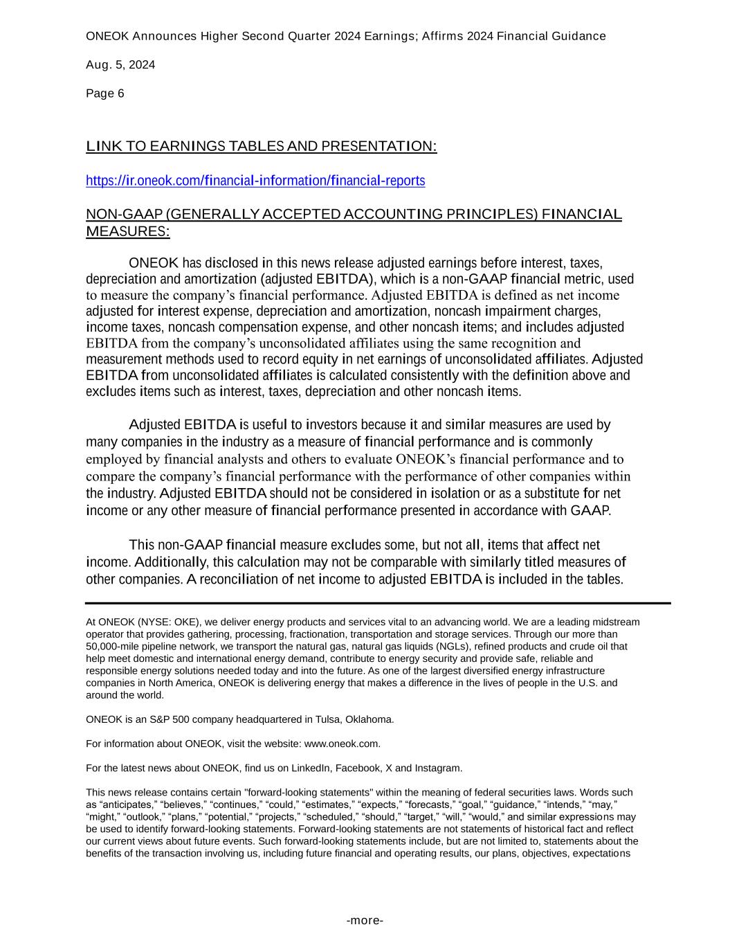 ONEOK Announces Higher Second Quarter 2024 Earnings; Affirms 2024 Financial Guidance Aug. 5, 2024 Page 6 -more- LINK TO EARNINGS TABLES AND PRESENTATION: https://ir.oneok.com/financial-information/financial-reports NON-GAAP (GENERALLY ACCEPTED ACCOUNTING PRINCIPLES) FINANCIAL MEASURES: ONEOK has disclosed in this news release adjusted earnings before interest, taxes, depreciation and amortization (adjusted EBITDA), which is a non-GAAP financial metric, used to measure the company’s financial performance. Adjusted EBITDA is defined as net income adjusted for interest expense, depreciation and amortization, noncash impairment charges, income taxes, noncash compensation expense, and other noncash items; and includes adjusted EBITDA from the company’s unconsolidated affiliates using the same recognition and measurement methods used to record equity in net earnings of unconsolidated affiliates. Adjusted EBITDA from unconsolidated affiliates is calculated consistently with the definition above and excludes items such as interest, taxes, depreciation and other noncash items. Adjusted EBITDA is useful to investors because it and similar measures are used by many companies in the industry as a measure of financial performance and is commonly employed by financial analysts and others to evaluate ONEOK’s financial performance and to compare the company’s financial performance with the performance of other companies within the industry. Adjusted EBITDA should not be considered in isolation or as a substitute for net income or any other measure of financial performance presented in accordance with GAAP. This non-GAAP financial measure excludes some, but not all, items that affect net income. Additionally, this calculation may not be comparable with similarly titled measures of other companies. A reconciliation of net income to adjusted EBITDA is included in the tables. At ONEOK (NYSE: OKE), we deliver energy products and services vital to an advancing world. We are a leading midstream operator that provides gathering, processing, fractionation, transportation and storage services. Through our more than 50,000-mile pipeline network, we transport the natural gas, natural gas liquids (NGLs), refined products and crude oil that help meet domestic and international energy demand, contribute to energy security and provide safe, reliable and responsible energy solutions needed today and into the future. As one of the largest diversified energy infrastructure companies in North America, ONEOK is delivering energy that makes a difference in the lives of people in the U.S. and around the world. ONEOK is an S&P 500 company headquartered in Tulsa, Oklahoma. For information about ONEOK, visit the website: www.oneok.com. For the latest news about ONEOK, find us on LinkedIn, Facebook, X and Instagram. This news release contains certain "forward-looking statements" within the meaning of federal securities laws. Words such as “anticipates,” “believes,” “continues,” “could,” “estimates,” “expects,” “forecasts,” “goal,” “guidance,” “intends,” “may,” “might,” “outlook,” “plans,” “potential,” “projects,” “scheduled,” “should,” “target,” “will,” “would,” and similar expressions may be used to identify forward-looking statements. Forward-looking statements are not statements of historical fact and reflect our current views about future events. Such forward-looking statements include, but are not limited to, statements about the benefits of the transaction involving us, including future financial and operating results, our plans, objectives, expectations