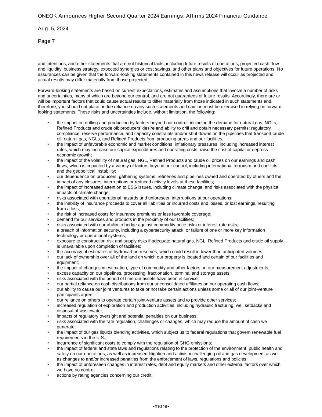 ONEOK Announces Higher Second Quarter 2024 Earnings; Affirms 2024 Financial Guidance Aug. 5, 2024 Page 7 -more- and intentions, and other statements that are not historical facts, including future results of operations, projected cash flow and liquidity, business strategy, expected synergies or cost savings, and other plans and objectives for future operations. No assurances can be given that the forward-looking statements contained in this news release will occur as projected and actual results may differ materially from those projected. Forward-looking statements are based on current expectations, estimates and assumptions that involve a number of risks and uncertainties, many of which are beyond our control, and are not guarantees of future results. Accordingly, there are or will be important factors that could cause actual results to differ materially from those indicated in such statements and, therefore, you should not place undue reliance on any such statements and caution must be exercised in relying on forward- looking statements. These risks and uncertainties include, without limitation, the following: • the impact on drilling and production by factors beyond our control, including the demand for natural gas, NGLs, Refined Products and crude oil; producers’ desire and ability to drill and obtain necessary permits; regulatory compliance; reserve performance; and capacity constraints and/or shut downs on the pipelines that transport crude oil, natural gas, NGLs, and Refined Products from producing areas and our facilities; • the impact of unfavorable economic and market conditions, inflationary pressures, including increased interest rates, which may increase our capital expenditures and operating costs, raise the cost of capital or depress economic growth; • the impact of the volatility of natural gas, NGL, Refined Products and crude oil prices on our earnings and cash flows, which is impacted by a variety of factors beyond our control, including international terrorism and conflicts and the geopolitical instability; • our dependence on producers, gathering systems, refineries and pipelines owned and operated by others and the impact of any closures, interruptions or reduced activity levels at these facilities; • the impact of increased attention to ESG issues, including climate change, and risks associated with the physical impacts of climate change; • risks associated with operational hazards and unforeseen interruptions at our operations; • the inability of insurance proceeds to cover all liabilities or incurred costs and losses, or lost earnings, resulting from a loss; • the risk of increased costs for insurance premiums or less favorable coverage; • demand for our services and products in the proximity of our facilities; • risks associated with our ability to hedge against commodity price risks or interest rate risks; • a breach of information security, including a cybersecurity attack, or failure of one or more key information technology or operational systems; • exposure to construction risk and supply risks if adequate natural gas, NGL, Refined Products and crude oil supply is unavailable upon completion of facilities; • the accuracy of estimates of hydrocarbon reserves, which could result in lower than anticipated volumes; • our lack of ownership over all of the land on which our property is located and certain of our facilities and equipment; • the impact of changes in estimation, type of commodity and other factors on our measurement adjustments; • excess capacity on our pipelines, processing, fractionation, terminal and storage assets; • risks associated with the period of time our assets have been in service; • our partial reliance on cash distributions from our unconsolidated affiliates on our operating cash flows; • our ability to cause our joint ventures to take or not take certain actions unless some or all of our joint-venture participants agree; • our reliance on others to operate certain joint-venture assets and to provide other services; • increased regulation of exploration and production activities, including hydraulic fracturing, well setbacks and disposal of wastewater; • impacts of regulatory oversight and potential penalties on our business; • risks associated with the rate regulation, challenges or changes, which may reduce the amount of cash we generate; • the impact of our gas liquids blending activities, which subject us to federal regulations that govern renewable fuel requirements in the U.S.; • incurrence of significant costs to comply with the regulation of GHG emissions; • the impact of federal and state laws and regulations relating to the protection of the environment, public health and safety on our operations, as well as increased litigation and activism challenging oil and gas development as well as changes to and/or increased penalties from the enforcement of laws, regulations and policies; • the impact of unforeseen changes in interest rates, debt and equity markets and other external factors over which we have no control; • actions by rating agencies concerning our credit;