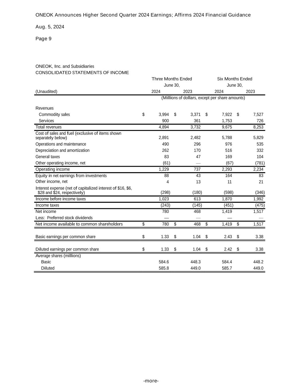 ONEOK Announces Higher Second Quarter 2024 Earnings; Affirms 2024 Financial Guidance Aug. 5, 2024 Page 9 -more- ONEOK, Inc. and Subsidiaries CONSOLIDATED STATEMENTS OF INCOME Three Months Ended Six Months Ended June 30, June 30, (Unaudited) 2024 2023 2024 2023 (Millions of dollars, except per share amounts) Revenues Commodity sales $ 3,994 $ 3,371 $ 7,922 $ 7,527 Services 900 361 1,753 726 Total revenues 4,894 3,732 9,675 8,253 Cost of sales and fuel (exclusive of items shown separately below) 2,891 2,482 5,788 5,829 Operations and maintenance 490 296 976 535 Depreciation and amortization 262 170 516 332 General taxes 83 47 169 104 Other operating income, net (61) — (67) (781) Operating income 1,229 737 2,293 2,234 Equity in net earnings from investments 88 43 164 83 Other income, net 4 13 11 21 Interest expense (net of capitalized interest of $16, $6, $28 and $24, respectively) (298) (180) (598) (346) Income before income taxes 1,023 613 1,870 1,992 Income taxes (243) (145) (451) (475) Net income 780 468 1,419 1,517 Less: Preferred stock dividends — — — — Net income available to common shareholders $ 780 $ 468 $ 1,419 $ 1,517 Basic earnings per common share $ 1.33 $ 1.04 $ 2.43 $ 3.38 Diluted earnings per common share $ 1.33 $ 1.04 $ 2.42 $ 3.38 Average shares (millions) Basic 584.6 448.3 584.4 448.2 Diluted 585.8 449.0 585.7 449.0