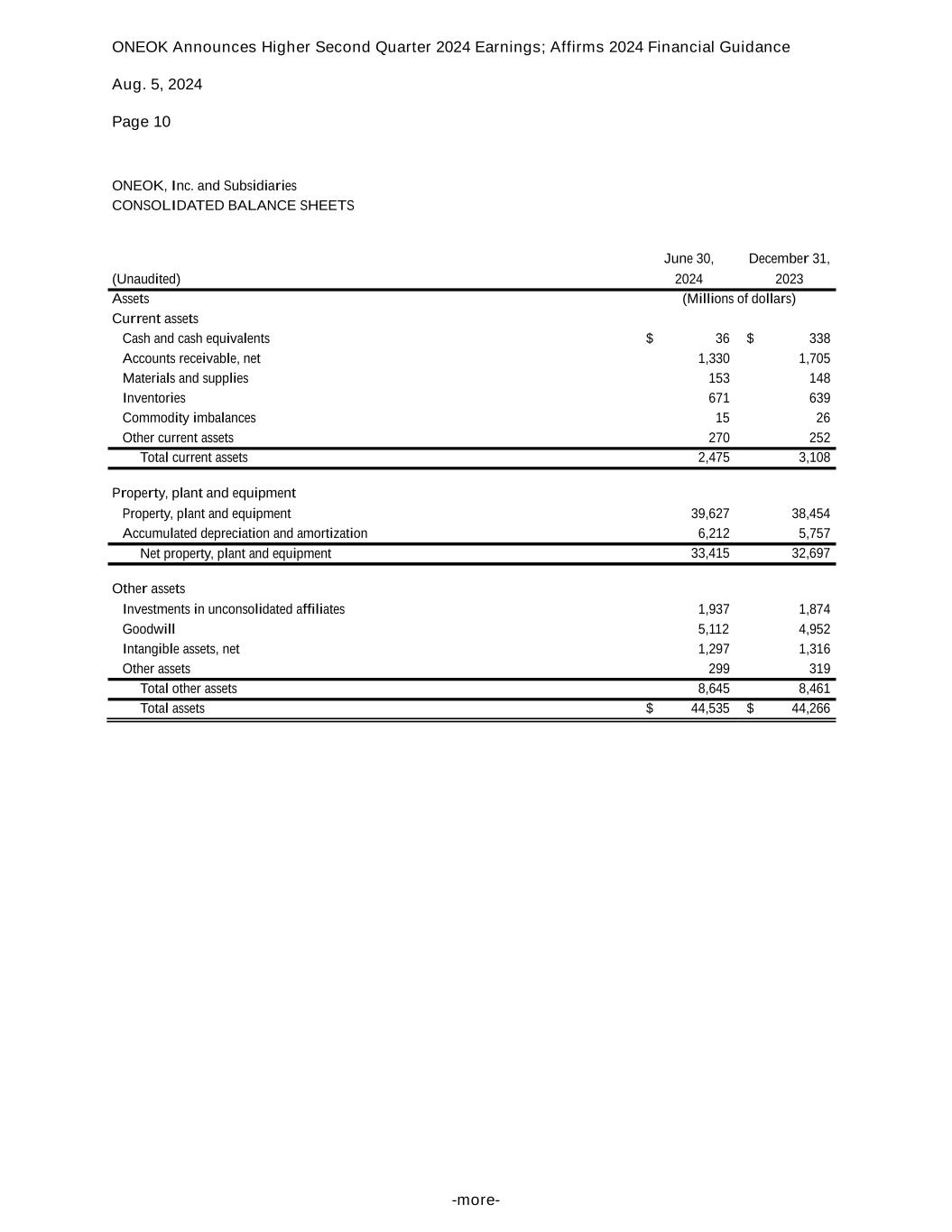 ONEOK Announces Higher Second Quarter 2024 Earnings; Affirms 2024 Financial Guidance Aug. 5, 2024 Page 10 -more- ONEOK, Inc. and Subsidiaries CONSOLIDATED BALANCE SHEETS June 30, December 31, (Unaudited) 2024 2023 Assets (Millions of dollars) Current assets Cash and cash equivalents $ 36 $ 338 Accounts receivable, net 1,330 1,705 Materials and supplies 153 148 Inventories 671 639 Commodity imbalances 15 26 Other current assets 270 252 Total current assets 2,475 3,108 Property, plant and equipment Property, plant and equipment 39,627 38,454 Accumulated depreciation and amortization 6,212 5,757 Net property, plant and equipment 33,415 32,697 Other assets Investments in unconsolidated affiliates 1,937 1,874 Goodwill 5,112 4,952 Intangible assets, net 1,297 1,316 Other assets 299 319 Total other assets 8,645 8,461 Total assets $ 44,535 $ 44,266