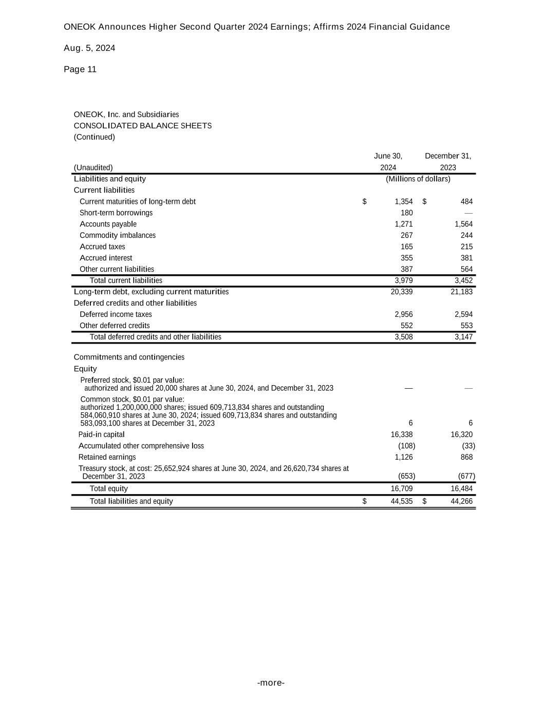 ONEOK Announces Higher Second Quarter 2024 Earnings; Affirms 2024 Financial Guidance Aug. 5, 2024 Page 11 -more- ONEOK, Inc. and Subsidiaries CONSOLIDATED BALANCE SHEETS (Continued) June 30, December 31, (Unaudited) 2024 2023 Liabilities and equity (Millions of dollars) Current liabilities Current maturities of long-term debt $ 1,354 $ 484 Short-term borrowings 180 — Accounts payable 1,271 1,564 Commodity imbalances 267 244 Accrued taxes 165 215 Accrued interest 355 381 Other current liabilities 387 564 Total current liabilities 3,979 3,452 Long-term debt, excluding current maturities 20,339 21,183 Deferred credits and other liabilities Deferred income taxes 2,956 2,594 Other deferred credits 552 553 Total deferred credits and other liabilities 3,508 3,147 Commitments and contingencies Equity Preferred stock, $0.01 par value: authorized and issued 20,000 shares at June 30, 2024, and December 31, 2023 — — Common stock, $0.01 par value: authorized 1,200,000,000 shares; issued 609,713,834 shares and outstanding 584,060,910 shares at June 30, 2024; issued 609,713,834 shares and outstanding 583,093,100 shares at December 31, 2023 6 6 Paid-in capital 16,338 16,320 Accumulated other comprehensive loss (108) (33) Retained earnings 1,126 868 Treasury stock, at cost: 25,652,924 shares at June 30, 2024, and 26,620,734 shares at December 31, 2023 (653) (677) Total equity 16,709 16,484 Total liabilities and equity $ 44,535 $ 44,266