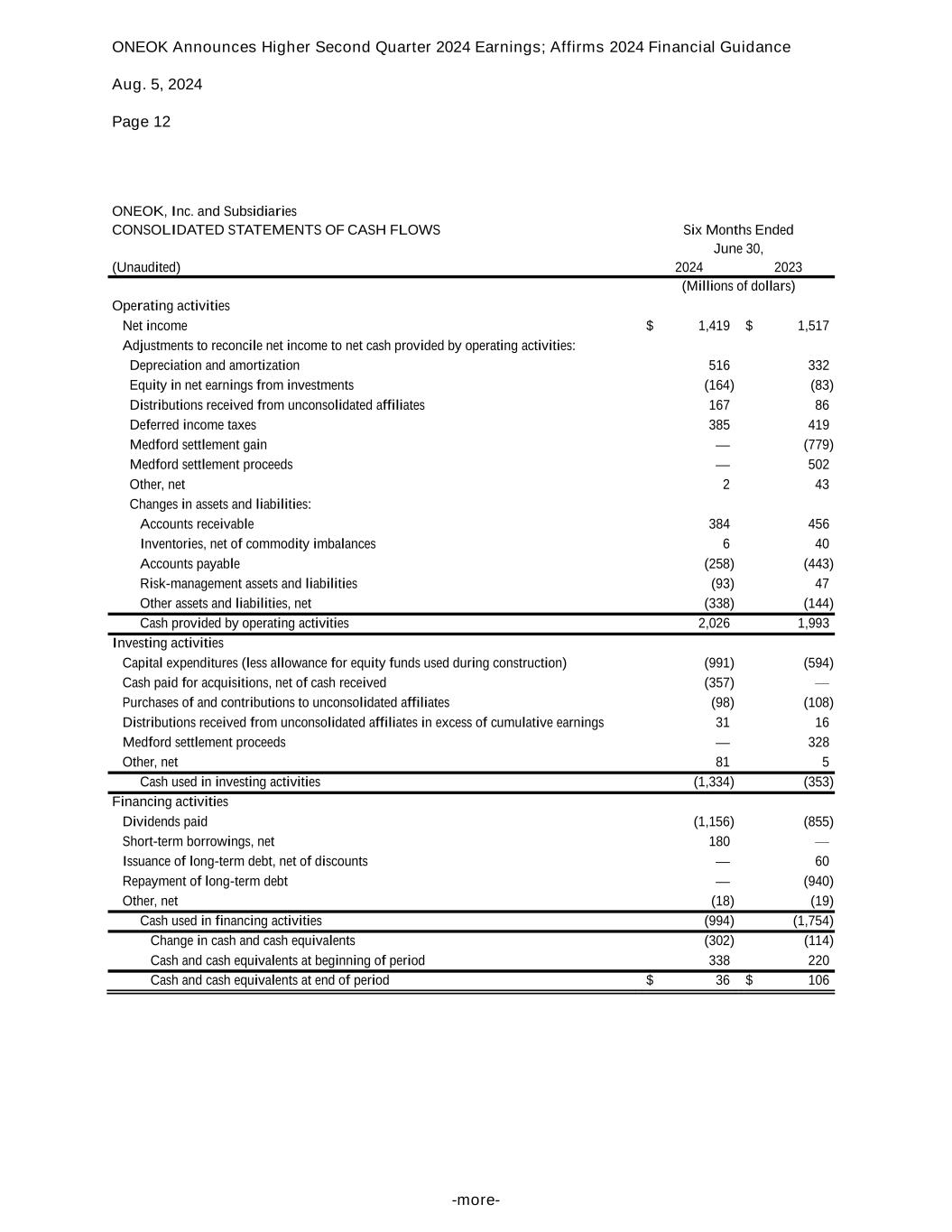 ONEOK Announces Higher Second Quarter 2024 Earnings; Affirms 2024 Financial Guidance Aug. 5, 2024 Page 12 -more- ONEOK, Inc. and Subsidiaries CONSOLIDATED STATEMENTS OF CASH FLOWS Six Months Ended June 30, (Unaudited) 2024 2023 (Millions of dollars) Operating activities Net income $ 1,419 $ 1,517 Adjustments to reconcile net income to net cash provided by operating activities: Depreciation and amortization 516 332 Equity in net earnings from investments (164) (83) Distributions received from unconsolidated affiliates 167 86 Deferred income taxes 385 419 Medford settlement gain — (779) Medford settlement proceeds — 502 Other, net 2 43 Changes in assets and liabilities: Accounts receivable 384 456 Inventories, net of commodity imbalances 6 40 Accounts payable (258) (443) Risk-management assets and liabilities (93) 47 Other assets and liabilities, net (338) (144) Cash provided by operating activities 2,026 1,993 Investing activities Capital expenditures (less allowance for equity funds used during construction) (991) (594) Cash paid for acquisitions, net of cash received (357) — Purchases of and contributions to unconsolidated affiliates (98) (108) Distributions received from unconsolidated affiliates in excess of cumulative earnings 31 16 Medford settlement proceeds — 328 Other, net 81 5 Cash used in investing activities (1,334) (353) Financing activities Dividends paid (1,156) (855) Short-term borrowings, net 180 — Issuance of long-term debt, net of discounts — 60 Repayment of long-term debt — (940) Other, net (18) (19) Cash used in financing activities (994) (1,754) Change in cash and cash equivalents (302) (114) Cash and cash equivalents at beginning of period 338 220 Cash and cash equivalents at end of period $ 36 $ 106