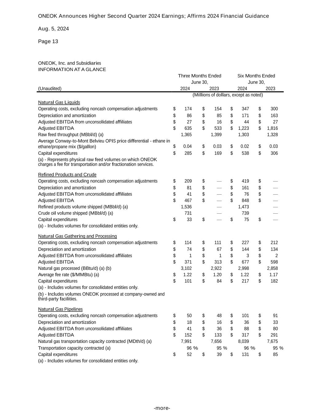 ONEOK Announces Higher Second Quarter 2024 Earnings; Affirms 2024 Financial Guidance Aug. 5, 2024 Page 13 -more- ONEOK, Inc. and Subsidiaries INFORMATION AT A GLANCE Three Months Ended Six Months Ended June 30, June 30, (Unaudited) 2024 2023 2024 2023 (Millions of dollars, except as noted) Natural Gas Liquids Operating costs, excluding noncash compensation adjustments $ 174 $ 154 $ 347 $ 300 Depreciation and amortization $ 86 $ 85 $ 171 $ 163 Adjusted EBITDA from unconsolidated affiliates $ 27 $ 16 $ 44 $ 27 Adjusted EBITDA $ 635 $ 533 $ 1,223 $ 1,816 Raw feed throughput (MBbl/d) (a) 1,365 1,399 1,303 1,328 Average Conway-to-Mont Belvieu OPIS price differential - ethane in ethane/propane mix ($/gallon) $ 0.04 $ 0.03 $ 0.02 $ 0.03 Capital expenditures $ 285 $ 169 $ 538 $ 306 (a) - Represents physical raw feed volumes on which ONEOK charges a fee for transportation and/or fractionation services. Refined Products and Crude Operating costs, excluding noncash compensation adjustments $ 209 $ — $ 419 $ — Depreciation and amortization $ 81 $ — $ 161 $ — Adjusted EBITDA from unconsolidated affiliates $ 41 $ — $ 76 $ — Adjusted EBITDA $ 467 $ — $ 848 $ — Refined products volume shipped (MBbl/d) (a) 1,536 — 1,473 — Crude oil volume shipped (MBbl/d) (a) 731 — 739 — Capital expenditures $ 33 $ — $ 75 $ — (a) - Includes volumes for consolidated entities only. Natural Gas Gathering and Processing Operating costs, excluding noncash compensation adjustments $ 114 $ 111 $ 227 $ 212 Depreciation and amortization $ 74 $ 67 $ 144 $ 134 Adjusted EBITDA from unconsolidated affiliates $ 1 $ 1 $ 3 $ 2 Adjusted EBITDA $ 371 $ 313 $ 677 $ 598 Natural gas processed (BBtu/d) (a) (b) 3,102 2,922 2,998 2,858 Average fee rate ($/MMBtu) (a) $ 1.22 $ 1.20 $ 1.22 $ 1.17 Capital expenditures $ 101 $ 84 $ 217 $ 182 (a) - Includes volumes for consolidated entities only. (b) - Includes volumes ONEOK processed at company-owned and third-party facilities. Natural Gas Pipelines Operating costs, excluding noncash compensation adjustments $ 50 $ 48 $ 101 $ 91 Depreciation and amortization $ 18 $ 16 $ 36 $ 33 Adjusted EBITDA from unconsolidated affiliates $ 41 $ 36 $ 88 $ 80 Adjusted EBITDA $ 152 $ 133 $ 317 $ 291 Natural gas transportation capacity contracted (MDth/d) (a) 7,991 7,656 8,039 7,675 Transportation capacity contracted (a) 96 % 95 % 96 % 95 % Capital expenditures $ 52 $ 39 $ 131 $ 85 (a) - Includes volumes for consolidated entities only.