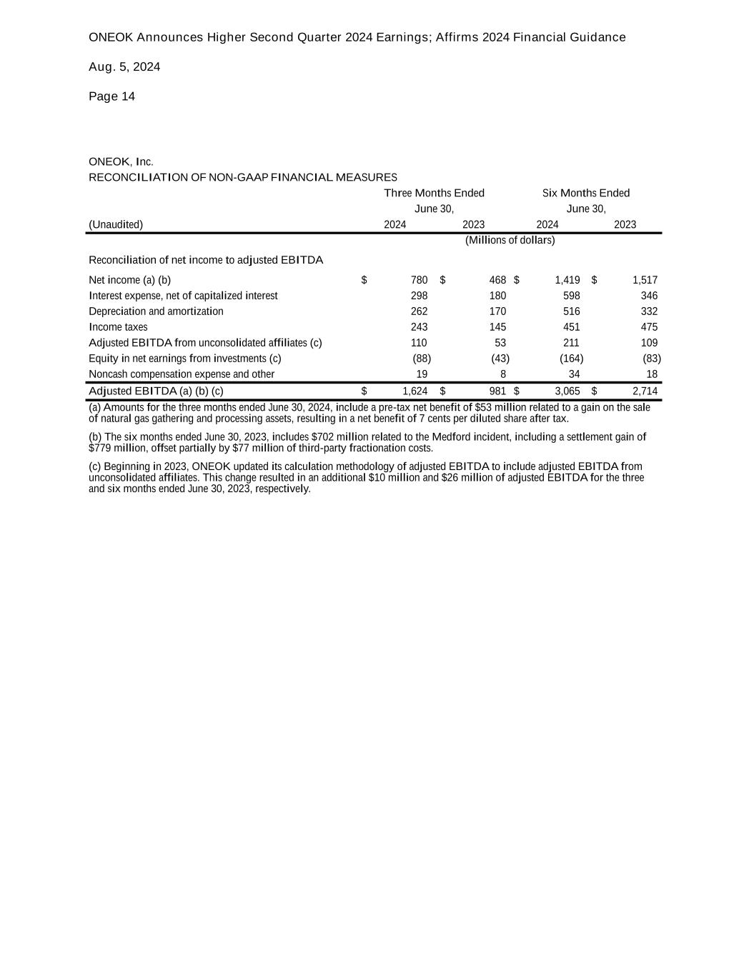 ONEOK Announces Higher Second Quarter 2024 Earnings; Affirms 2024 Financial Guidance Aug. 5, 2024 Page 14 -more- ONEOK, Inc. RECONCILIATION OF NON-GAAP FINANCIAL MEASURES Three Months Ended Six Months Ended June 30, June 30, (Unaudited) 2024 2023 2024 2023 (Millions of dollars) Reconciliation of net income to adjusted EBITDA Net income (a) (b) $ 780 $ 468 $ 1,419 $ 1,517 Interest expense, net of capitalized interest 298 180 598 346 Depreciation and amortization 262 170 516 332 Income taxes 243 145 451 475 Adjusted EBITDA from unconsolidated affiliates (c) 110 53 211 109 Equity in net earnings from investments (c) (88) (43) (164) (83) Noncash compensation expense and other 19 8 34 18 Adjusted EBITDA (a) (b) (c) $ 1,624 $ 981 $ 3,065 $ 2,714 (a) Amounts for the three months ended June 30, 2024, include a pre-tax net benefit of $53 million related to a gain on the sale of natural gas gathering and processing assets, resulting in a net benefit of 7 cents per diluted share after tax. (b) The six months ended June 30, 2023, includes $702 million related to the Medford incident, including a settlement gain of $779 million, offset partially by $77 million of third-party fractionation costs. (c) Beginning in 2023, ONEOK updated its calculation methodology of adjusted EBITDA to include adjusted EBITDA from unconsolidated affiliates. This change resulted in an additional $10 million and $26 million of adjusted EBITDA for the three and six months ended June 30, 2023, respectively.