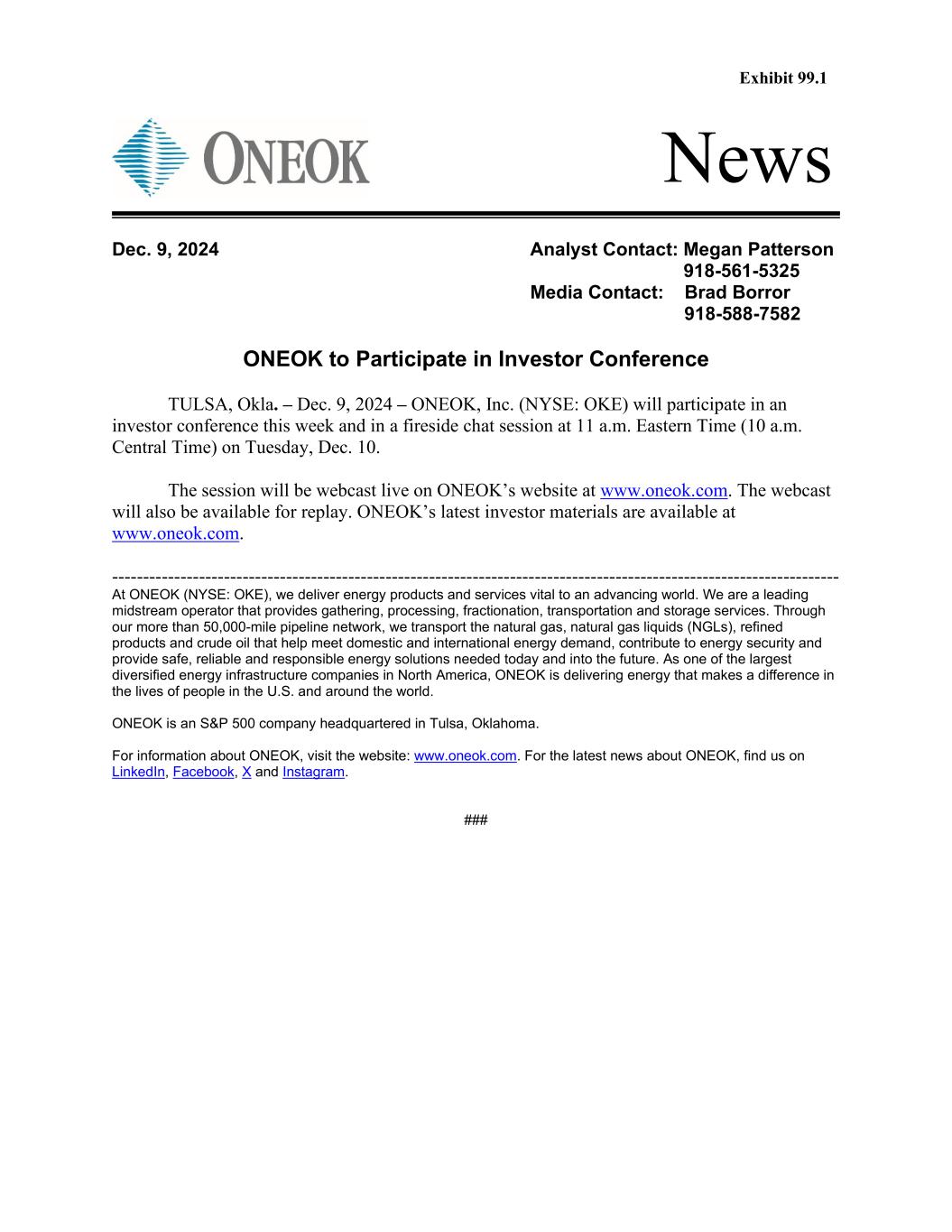 News ONEOK to Participate in Investor Conference TULSA, Okla. – Dec. 9, 2024 – ONEOK, Inc. (NYSE: OKE) will participate in an investor conference this week and in a fireside chat session at 11 a.m. Eastern Time (10 a.m. Central Time) on Tuesday, Dec. 10. The session will be webcast live on ONEOK’s website at www.oneok.com. The webcast will also be available for replay. ONEOK’s latest investor materials are available at www.oneok.com. --------------------------------------------------------------------------------------------------------------------- At ONEOK (NYSE: OKE), we deliver energy products and services vital to an advancing world. We are a leading midstream operator that provides gathering, processing, fractionation, transportation and storage services. Through our more than 50,000-mile pipeline network, we transport the natural gas, natural gas liquids (NGLs), refined products and crude oil that help meet domestic and international energy demand, contribute to energy security and provide safe, reliable and responsible energy solutions needed today and into the future. As one of the largest diversified energy infrastructure companies in North America, ONEOK is delivering energy that makes a difference in the lives of people in the U.S. and around the world. ONEOK is an S&P 500 company headquartered in Tulsa, Oklahoma. For information about ONEOK, visit the website: www.oneok.com. For the latest news about ONEOK, find us on LinkedIn, Facebook, X and Instagram. ### Dec. 9, 2024 Analyst Contact: Megan Patterson 918-561-5325 Media Contact: Brad Borror 918-588-7582 Exhibit 99.1