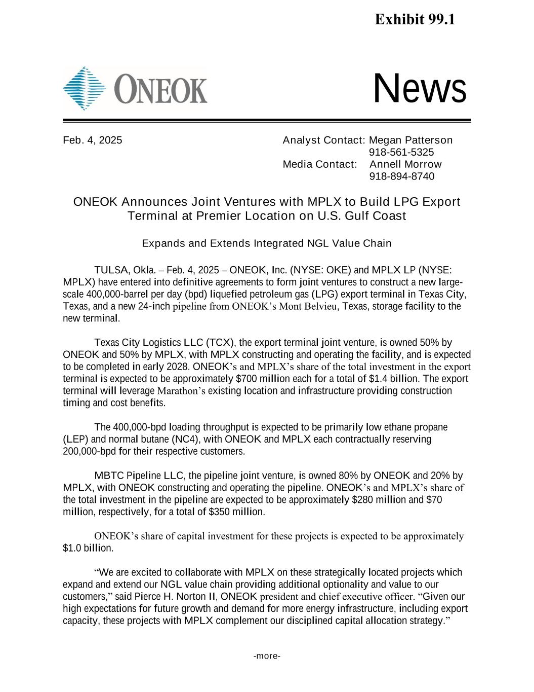 -more- News ONEOK Announces Joint Ventures with MPLX to Build LPG Export Terminal at Premier Location on U.S. Gulf Coast Expands and Extends Integrated NGL Value Chain TULSA, Okla. – Feb. 4, 2025 – ONEOK, Inc. (NYSE: OKE) and MPLX LP (NYSE: MPLX) have entered into definitive agreements to form joint ventures to construct a new large- scale 400,000-barrel per day (bpd) liquefied petroleum gas (LPG) export terminal in Texas City, Texas, and a new 24-inch pipeline from ONEOK’s Mont Belvieu, Texas, storage facility to the new terminal. Texas City Logistics LLC (TCX), the export terminal joint venture, is owned 50% by ONEOK and 50% by MPLX, with MPLX constructing and operating the facility, and is expected to be completed in early 2028. ONEOK’s and MPLX’s share of the total investment in the export terminal is expected to be approximately $700 million each for a total of $1.4 billion. The export terminal will leverage Marathon’s existing location and infrastructure providing construction timing and cost benefits. The 400,000-bpd loading throughput is expected to be primarily low ethane propane (LEP) and normal butane (NC4), with ONEOK and MPLX each contractually reserving 200,000-bpd for their respective customers. MBTC Pipeline LLC, the pipeline joint venture, is owned 80% by ONEOK and 20% by MPLX, with ONEOK constructing and operating the pipeline. ONEOK’s and MPLX’s share of the total investment in the pipeline are expected to be approximately $280 million and $70 million, respectively, for a total of $350 million. ONEOK’s share of capital investment for these projects is expected to be approximately $1.0 billion. “We are excited to collaborate with MPLX on these strategically located projects which expand and extend our NGL value chain providing additional optionality and value to our customers,” said Pierce H. Norton II, ONEOK president and chief executive officer. “Given our high expectations for future growth and demand for more energy infrastructure, including export capacity, these projects with MPLX complement our disciplined capital allocation strategy.” Feb. 4, 2025 Analyst Contact: Megan Patterson 918-561-5325 Media Contact: Annell Morrow 918-894-8740 Exhibit 99.1