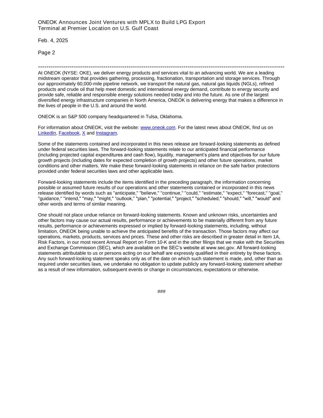 ONEOK Announces Joint Ventures with MPLX to Build LPG Export Terminal at Premier Location on U.S. Gulf Coast Feb. 4, 2025 Page 2 --------------------------------------------------------------------------------------------------------------------- At ONEOK (NYSE: OKE), we deliver energy products and services vital to an advancing world. We are a leading midstream operator that provides gathering, processing, fractionation, transportation and storage services. Through our approximately 60,000-mile pipeline network, we transport the natural gas, natural gas liquids (NGLs), refined products and crude oil that help meet domestic and international energy demand, contribute to energy security and provide safe, reliable and responsible energy solutions needed today and into the future. As one of the largest diversified energy infrastructure companies in North America, ONEOK is delivering energy that makes a difference in the lives of people in the U.S. and around the world. ONEOK is an S&P 500 company headquartered in Tulsa, Oklahoma. For information about ONEOK, visit the website: www.oneok.com. For the latest news about ONEOK, find us on LinkedIn, Facebook, X and Instagram. Some of the statements contained and incorporated in this news release are forward-looking statements as defined under federal securities laws. The forward-looking statements relate to our anticipated financial performance (including projected capital expenditures and cash flow), liquidity, management’s plans and objectives for our future growth projects (including dates for expected completion of growth projects) and other future operations, market conditions and other matters. We make these forward-looking statements in reliance on the safe harbor protections provided under federal securities laws and other applicable laws. Forward-looking statements include the items identified in the preceding paragraph, the information concerning possible or assumed future results of our operations and other statements contained or incorporated in this news release identified by words such as "anticipate," "believe," "continue," "could," "estimate," "expect," "forecast," "goal," "guidance," "intend," "may," "might," “outlook,” "plan," "potential," "project," "scheduled," "should," "will," "would" and other words and terms of similar meaning. One should not place undue reliance on forward-looking statements. Known and unknown risks, uncertainties and other factors may cause our actual results, performance or achievements to be materially different from any future results, performance or achievements expressed or implied by forward-looking statements, including, without limitation, ONEOK being unable to achieve the anticipated benefits of the transaction. Those factors may affect our operations, markets, products, services and prices. These and other risks are described in greater detail in Item 1A, Risk Factors, in our most recent Annual Report on Form 10-K and in the other filings that we make with the Securities and Exchange Commission (SEC), which are available on the SEC’s website at www.sec.gov. All forward-looking statements attributable to us or persons acting on our behalf are expressly qualified in their entirety by these factors. Any such forward-looking statement speaks only as of the date on which such statement is made, and, other than as required under securities laws, we undertake no obligation to update publicly any forward-looking statement whether as a result of new information, subsequent events or change in circumstances, expectations or otherwise. ###