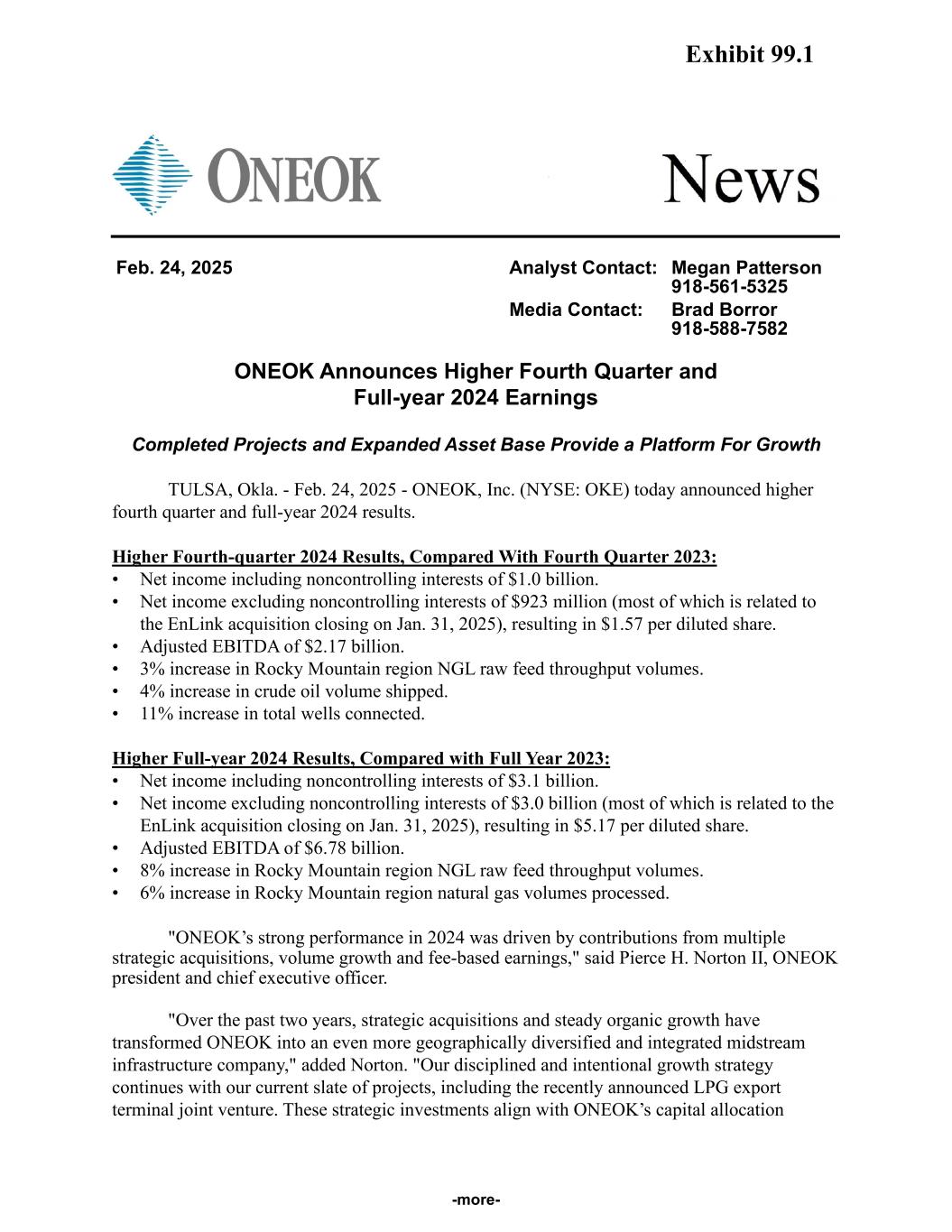 -more- Feb. 24, 2025 Analyst Contact: Megan Patterson 918-561-5325 Media Contact: Brad Borror 918-588-7582 ONEOK Announces Higher Fourth Quarter and Full-year 2024 Earnings Completed Projects and Expanded Asset Base Provide a Platform For Growth TULSA, Okla. - Feb. 24, 2025 - ONEOK, Inc. (NYSE: OKE) today announced higher fourth quarter and full-year 2024 results. Higher Fourth-quarter 2024 Results, Compared With Fourth Quarter 2023: • Net income including noncontrolling interests of $1.0 billion. • Net income excluding noncontrolling interests of $923 million (most of which is related to the EnLink acquisition closing on Jan. 31, 2025), resulting in $1.57 per diluted share. • Adjusted EBITDA of $2.17 billion. • 3% increase in Rocky Mountain region NGL raw feed throughput volumes. • 4% increase in crude oil volume shipped. • 11% increase in total wells connected. Higher Full-year 2024 Results, Compared with Full Year 2023: • Net income including noncontrolling interests of $3.1 billion. • Net income excluding noncontrolling interests of $3.0 billion (most of which is related to the EnLink acquisition closing on Jan. 31, 2025), resulting in $5.17 per diluted share. • Adjusted EBITDA of $6.78 billion. • 8% increase in Rocky Mountain region NGL raw feed throughput volumes. • 6% increase in Rocky Mountain region natural gas volumes processed. "ONEOK’s strong performance in 2024 was driven by contributions from multiple strategic acquisitions, volume growth and fee-based earnings," said Pierce H. Norton II, ONEOK president and chief executive officer. "Over the past two years, strategic acquisitions and steady organic growth have transformed ONEOK into an even more geographically diversified and integrated midstream infrastructure company," added Norton. "Our disciplined and intentional growth strategy continues with our current slate of projects, including the recently announced LPG export terminal joint venture. These strategic investments align with ONEOK’s capital allocation Exhibit 99.1
