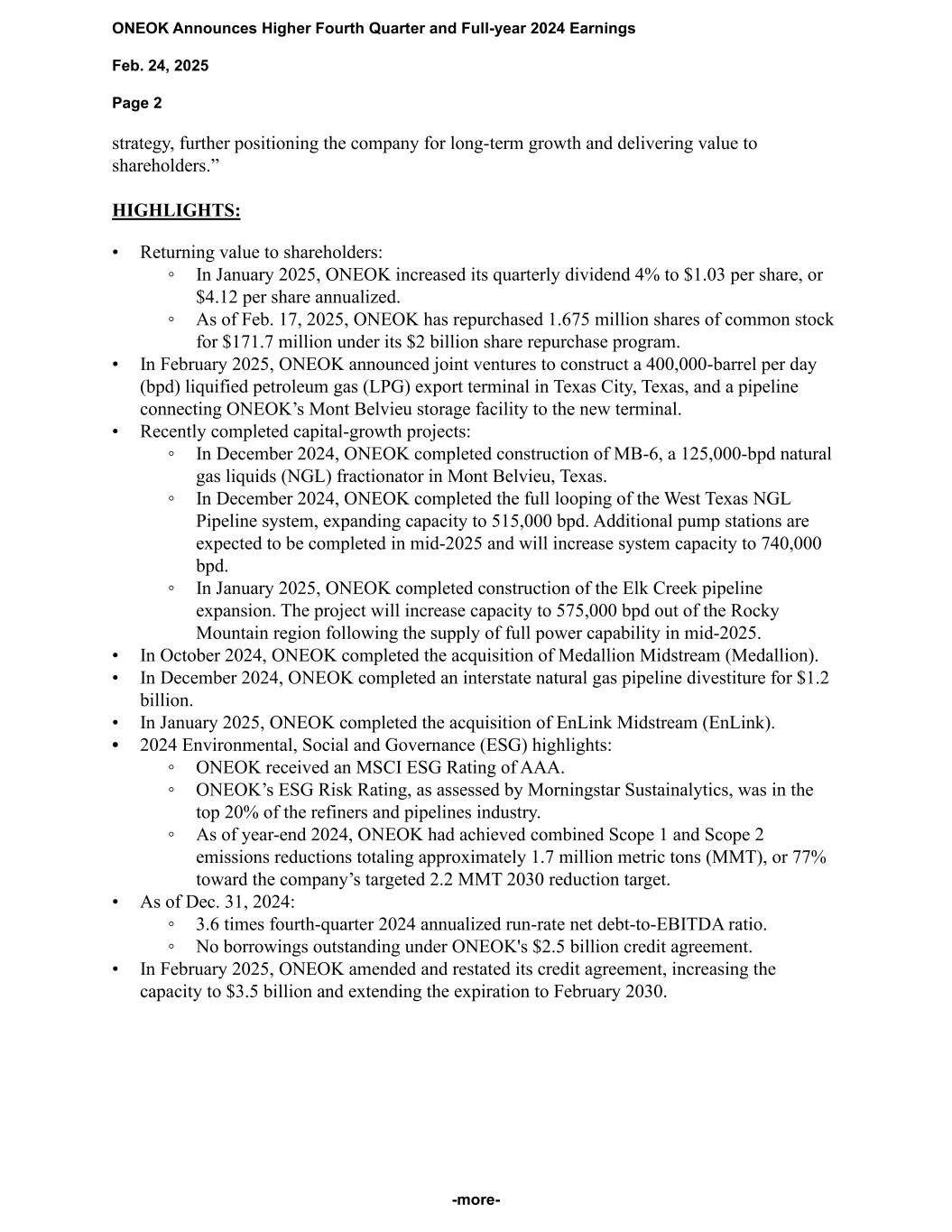 ONEOK Announces Higher Fourth Quarter and Full-year 2024 Earnings Feb. 24, 2025 Page 2 -more- strategy, further positioning the company for long-term growth and delivering value to shareholders.” HIGHLIGHTS: • Returning value to shareholders: ◦ In January 2025, ONEOK increased its quarterly dividend 4% to $1.03 per share, or $4.12 per share annualized. ◦ As of Feb. 17, 2025, ONEOK has repurchased 1.675 million shares of common stock for $171.7 million under its $2 billion share repurchase program. • In February 2025, ONEOK announced joint ventures to construct a 400,000-barrel per day (bpd) liquified petroleum gas (LPG) export terminal in Texas City, Texas, and a pipeline connecting ONEOK’s Mont Belvieu storage facility to the new terminal. • Recently completed capital-growth projects: ◦ In December 2024, ONEOK completed construction of MB-6, a 125,000-bpd natural gas liquids (NGL) fractionator in Mont Belvieu, Texas. ◦ In December 2024, ONEOK completed the full looping of the West Texas NGL Pipeline system, expanding capacity to 515,000 bpd. Additional pump stations are expected to be completed in mid-2025 and will increase system capacity to 740,000 bpd. ◦ In January 2025, ONEOK completed construction of the Elk Creek pipeline expansion. The project will increase capacity to 575,000 bpd out of the Rocky Mountain region following the supply of full power capability in mid-2025. • In October 2024, ONEOK completed the acquisition of Medallion Midstream (Medallion). • In December 2024, ONEOK completed an interstate natural gas pipeline divestiture for $1.2 billion. • In January 2025, ONEOK completed the acquisition of EnLink Midstream (EnLink). • 2024 Environmental, Social and Governance (ESG) highlights: ◦ ONEOK received an MSCI ESG Rating of AAA. ◦ ONEOK’s ESG Risk Rating, as assessed by Morningstar Sustainalytics, was in the top 20% of the refiners and pipelines industry. ◦ As of year-end 2024, ONEOK had achieved combined Scope 1 and Scope 2 emissions reductions totaling approximately 1.7 million metric tons (MMT), or 77% toward the company’s targeted 2.2 MMT 2030 reduction target. • As of Dec. 31, 2024: ◦ 3.6 times fourth-quarter 2024 annualized run-rate net debt-to-EBITDA ratio. ◦ No borrowings outstanding under ONEOK's $2.5 billion credit agreement. • In February 2025, ONEOK amended and restated its credit agreement, increasing the capacity to $3.5 billion and extending the expiration to February 2030.