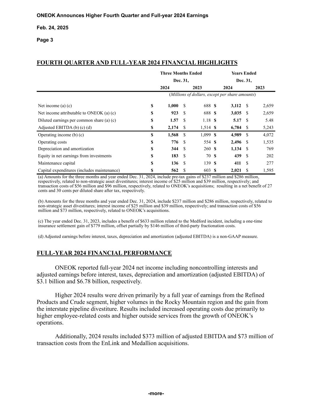 ONEOK Announces Higher Fourth Quarter and Full-year 2024 Earnings Feb. 24, 2025 Page 3 -more- FOURTH QUARTER AND FULL-YEAR 2024 FINANCIAL HIGHLIGHTS Three Months Ended Years Ended Dec. 31, Dec. 31, 2024 2023 2024 2023 (Millions of dollars, except per share amounts) Net income (a) (c) $ 1,000 $ 688 $ 3,112 $ 2,659 Net income attributable to ONEOK (a) (c) $ 923 $ 688 $ 3,035 $ 2,659 Diluted earnings per common share (a) (c) $ 1.57 $ 1.18 $ 5.17 $ 5.48 Adjusted EBITDA (b) (c) (d) $ 2,174 $ 1,514 $ 6,784 $ 5,243 Operating income (b) (c) $ 1,568 $ 1,099 $ 4,989 $ 4,072 Operating costs $ 776 $ 554 $ 2,496 $ 1,535 Depreciation and amortization $ 344 $ 260 $ 1,134 $ 769 Equity in net earnings from investments $ 183 $ 70 $ 439 $ 202 Maintenance capital $ 136 $ 139 $ 411 $ 277 Capital expenditures (includes maintenance) $ 562 $ 603 $ 2,021 $ 1,595 (a) Amounts for the three months and year ended Dec. 31, 2024, include pre-tax gains of $237 million and $286 million, respectively, related to non-strategic asset divestitures; interest income of $25 million and $39 million, respectively; and transaction costs of $56 million and $96 million, respectively, related to ONEOK’s acquisitions; resulting in a net benefit of 27 cents and 30 cents per diluted share after tax, respectively. (b) Amounts for the three months and year ended Dec. 31, 2024, include $237 million and $286 million, respectively, related to non-strategic asset divestitures; interest income of $25 million and $39 million, respectively; and transaction costs of $56 million and $73 million, respectively, related to ONEOK’s acquisitions. (c) The year ended Dec. 31, 2023, includes a benefit of $633 million related to the Medford incident, including a one-time insurance settlement gain of $779 million, offset partially by $146 million of third-party fractionation costs. (d) Adjusted earnings before interest, taxes, depreciation and amortization (adjusted EBITDA) is a non-GAAP measure. FULL-YEAR 2024 FINANCIAL PERFORMANCE ONEOK reported full-year 2024 net income including noncontrolling interests and adjusted earnings before interest, taxes, depreciation and amortization (adjusted EBITDA) of $3.1 billion and $6.78 billion, respectively. Higher 2024 results were driven primarily by a full year of earnings from the Refined Products and Crude segment, higher volumes in the Rocky Mountain region and the gain from the interstate pipeline divestiture. Results included increased operating costs due primarily to higher employee-related costs and higher outside services from the growth of ONEOK’s operations. Additionally, 2024 results included $373 million of adjusted EBITDA and $73 million of transaction costs from the EnLink and Medallion acquisitions.