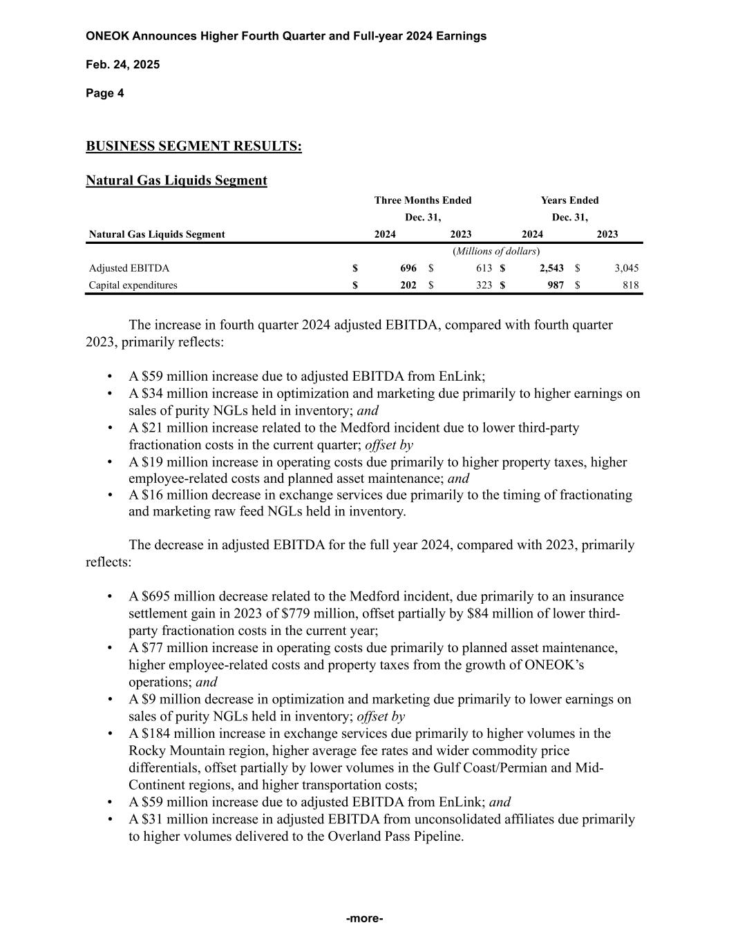 ONEOK Announces Higher Fourth Quarter and Full-year 2024 Earnings Feb. 24, 2025 Page 4 -more- BUSINESS SEGMENT RESULTS: Natural Gas Liquids Segment Three Months Ended Years Ended Dec. 31, Dec. 31, Natural Gas Liquids Segment 2024 2023 2024 2023 (Millions of dollars) Adjusted EBITDA $ 696 $ 613 $ 2,543 $ 3,045 Capital expenditures $ 202 $ 323 $ 987 $ 818 The increase in fourth quarter 2024 adjusted EBITDA, compared with fourth quarter 2023, primarily reflects: • A $59 million increase due to adjusted EBITDA from EnLink; • A $34 million increase in optimization and marketing due primarily to higher earnings on sales of purity NGLs held in inventory; and • A $21 million increase related to the Medford incident due to lower third-party fractionation costs in the current quarter; offset by • A $19 million increase in operating costs due primarily to higher property taxes, higher employee-related costs and planned asset maintenance; and • A $16 million decrease in exchange services due primarily to the timing of fractionating and marketing raw feed NGLs held in inventory. The decrease in adjusted EBITDA for the full year 2024, compared with 2023, primarily reflects: • A $695 million decrease related to the Medford incident, due primarily to an insurance settlement gain in 2023 of $779 million, offset partially by $84 million of lower third- party fractionation costs in the current year; • A $77 million increase in operating costs due primarily to planned asset maintenance, higher employee-related costs and property taxes from the growth of ONEOK’s operations; and • A $9 million decrease in optimization and marketing due primarily to lower earnings on sales of purity NGLs held in inventory; offset by • A $184 million increase in exchange services due primarily to higher volumes in the Rocky Mountain region, higher average fee rates and wider commodity price differentials, offset partially by lower volumes in the Gulf Coast/Permian and Mid- Continent regions, and higher transportation costs; • A $59 million increase due to adjusted EBITDA from EnLink; and • A $31 million increase in adjusted EBITDA from unconsolidated affiliates due primarily to higher volumes delivered to the Overland Pass Pipeline.