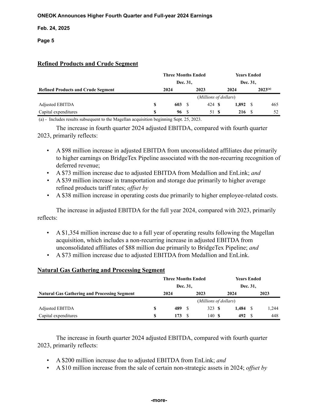 ONEOK Announces Higher Fourth Quarter and Full-year 2024 Earnings Feb. 24, 2025 Page 5 -more- Refined Products and Crude Segment Three Months Ended Years Ended Dec. 31, Dec. 31, Refined Products and Crude Segment 2024 2023 2024 2023(a) (Millions of dollars) Adjusted EBITDA $ 603 $ 424 $ 1,892 $ 465 Capital expenditures $ 96 $ 51 $ 216 $ 52 (a) - Includes results subsequent to the Magellan acquisition beginning Sept. 25, 2023. The increase in fourth quarter 2024 adjusted EBITDA, compared with fourth quarter 2023, primarily reflects: • A $98 million increase in adjusted EBITDA from unconsolidated affiliates due primarily to higher earnings on BridgeTex Pipeline associated with the non-recurring recognition of deferred revenue; • A $73 million increase due to adjusted EBITDA from Medallion and EnLink; and • A $39 million increase in transportation and storage due primarily to higher average refined products tariff rates; offset by • A $38 million increase in operating costs due primarily to higher employee-related costs. The increase in adjusted EBITDA for the full year 2024, compared with 2023, primarily reflects: • A $1,354 million increase due to a full year of operating results following the Magellan acquisition, which includes a non-recurring increase in adjusted EBITDA from unconsolidated affiliates of $88 million due primarily to BridgeTex Pipeline; and • A $73 million increase due to adjusted EBITDA from Medallion and EnLink. Natural Gas Gathering and Processing Segment Three Months Ended Years Ended Dec. 31, Dec. 31, Natural Gas Gathering and Processing Segment 2024 2023 2024 2023 (Millions of dollars) Adjusted EBITDA $ 489 $ 323 $ 1,484 $ 1,244 Capital expenditures $ 173 $ 140 $ 492 $ 448 The increase in fourth quarter 2024 adjusted EBITDA, compared with fourth quarter 2023, primarily reflects: • A $200 million increase due to adjusted EBITDA from EnLink; and • A $10 million increase from the sale of certain non-strategic assets in 2024; offset by