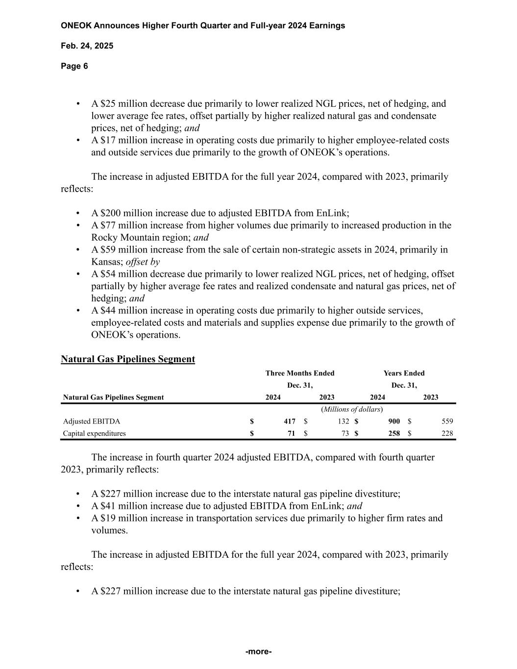 ONEOK Announces Higher Fourth Quarter and Full-year 2024 Earnings Feb. 24, 2025 Page 6 -more- • A $25 million decrease due primarily to lower realized NGL prices, net of hedging, and lower average fee rates, offset partially by higher realized natural gas and condensate prices, net of hedging; and • A $17 million increase in operating costs due primarily to higher employee-related costs and outside services due primarily to the growth of ONEOK’s operations. The increase in adjusted EBITDA for the full year 2024, compared with 2023, primarily reflects: • A $200 million increase due to adjusted EBITDA from EnLink; • A $77 million increase from higher volumes due primarily to increased production in the Rocky Mountain region; and • A $59 million increase from the sale of certain non-strategic assets in 2024, primarily in Kansas; offset by • A $54 million decrease due primarily to lower realized NGL prices, net of hedging, offset partially by higher average fee rates and realized condensate and natural gas prices, net of hedging; and • A $44 million increase in operating costs due primarily to higher outside services, employee-related costs and materials and supplies expense due primarily to the growth of ONEOK’s operations. Natural Gas Pipelines Segment Three Months Ended Years Ended Dec. 31, Dec. 31, Natural Gas Pipelines Segment 2024 2023 2024 2023 (Millions of dollars) Adjusted EBITDA $ 417 $ 132 $ 900 $ 559 Capital expenditures $ 71 $ 73 $ 258 $ 228 The increase in fourth quarter 2024 adjusted EBITDA, compared with fourth quarter 2023, primarily reflects: • A $227 million increase due to the interstate natural gas pipeline divestiture; • A $41 million increase due to adjusted EBITDA from EnLink; and • A $19 million increase in transportation services due primarily to higher firm rates and volumes. The increase in adjusted EBITDA for the full year 2024, compared with 2023, primarily reflects: • A $227 million increase due to the interstate natural gas pipeline divestiture;