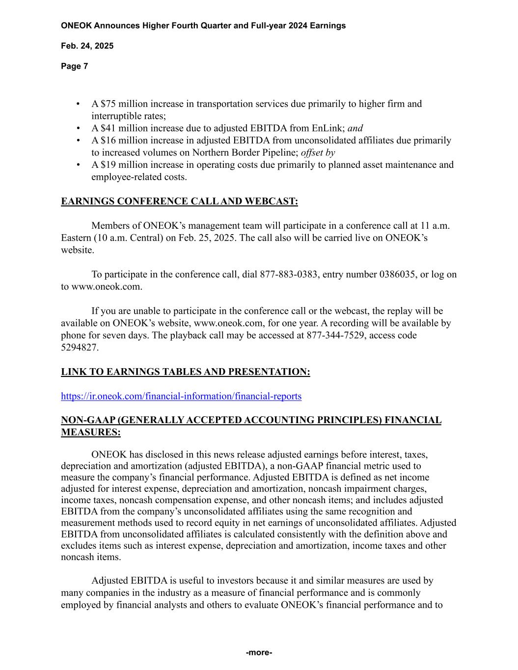 ONEOK Announces Higher Fourth Quarter and Full-year 2024 Earnings Feb. 24, 2025 Page 7 -more- • A $75 million increase in transportation services due primarily to higher firm and interruptible rates; • A $41 million increase due to adjusted EBITDA from EnLink; and • A $16 million increase in adjusted EBITDA from unconsolidated affiliates due primarily to increased volumes on Northern Border Pipeline; offset by • A $19 million increase in operating costs due primarily to planned asset maintenance and employee-related costs. EARNINGS CONFERENCE CALL AND WEBCAST: Members of ONEOK’s management team will participate in a conference call at 11 a.m. Eastern (10 a.m. Central) on Feb. 25, 2025. The call also will be carried live on ONEOK’s website. To participate in the conference call, dial 877-883-0383, entry number 0386035, or log on to www.oneok.com. If you are unable to participate in the conference call or the webcast, the replay will be available on ONEOK’s website, www.oneok.com, for one year. A recording will be available by phone for seven days. The playback call may be accessed at 877-344-7529, access code 5294827. LINK TO EARNINGS TABLES AND PRESENTATION: https://ir.oneok.com/financial-information/financial-reports NON-GAAP (GENERALLY ACCEPTED ACCOUNTING PRINCIPLES) FINANCIAL MEASURES: ONEOK has disclosed in this news release adjusted earnings before interest, taxes, depreciation and amortization (adjusted EBITDA), a non-GAAP financial metric used to measure the company’s financial performance. Adjusted EBITDA is defined as net income adjusted for interest expense, depreciation and amortization, noncash impairment charges, income taxes, noncash compensation expense, and other noncash items; and includes adjusted EBITDA from the company’s unconsolidated affiliates using the same recognition and measurement methods used to record equity in net earnings of unconsolidated affiliates. Adjusted EBITDA from unconsolidated affiliates is calculated consistently with the definition above and excludes items such as interest expense, depreciation and amortization, income taxes and other noncash items. Adjusted EBITDA is useful to investors because it and similar measures are used by many companies in the industry as a measure of financial performance and is commonly employed by financial analysts and others to evaluate ONEOK’s financial performance and to