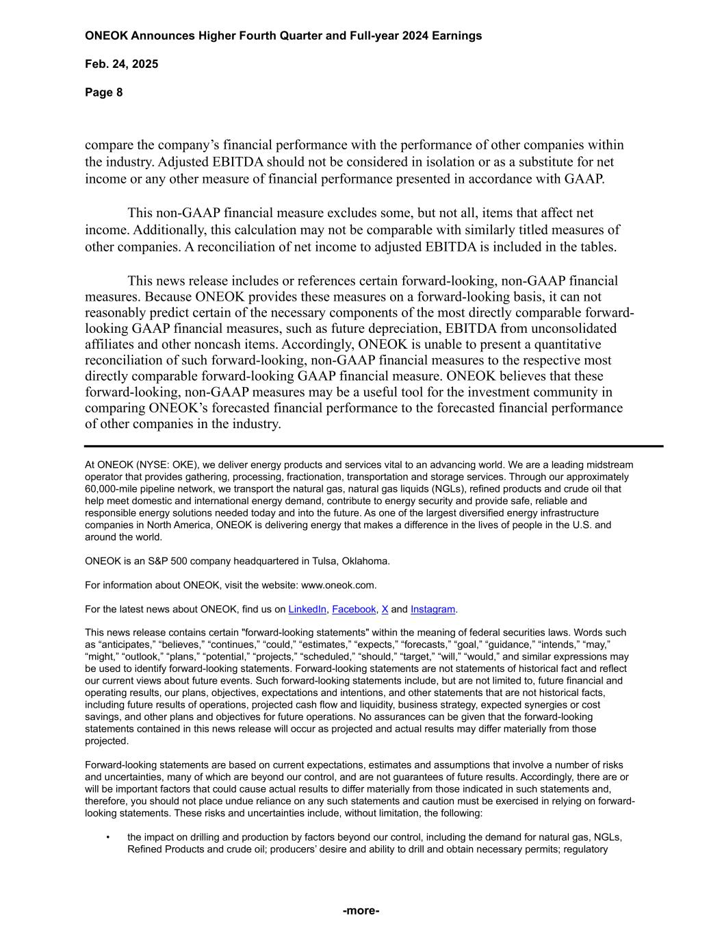 ONEOK Announces Higher Fourth Quarter and Full-year 2024 Earnings Feb. 24, 2025 Page 8 -more- compare the company’s financial performance with the performance of other companies within the industry. Adjusted EBITDA should not be considered in isolation or as a substitute for net income or any other measure of financial performance presented in accordance with GAAP. This non-GAAP financial measure excludes some, but not all, items that affect net income. Additionally, this calculation may not be comparable with similarly titled measures of other companies. A reconciliation of net income to adjusted EBITDA is included in the tables. This news release includes or references certain forward-looking, non-GAAP financial measures. Because ONEOK provides these measures on a forward-looking basis, it can not reasonably predict certain of the necessary components of the most directly comparable forward- looking GAAP financial measures, such as future depreciation, EBITDA from unconsolidated affiliates and other noncash items. Accordingly, ONEOK is unable to present a quantitative reconciliation of such forward-looking, non-GAAP financial measures to the respective most directly comparable forward-looking GAAP financial measure. ONEOK believes that these forward-looking, non-GAAP measures may be a useful tool for the investment community in comparing ONEOK’s forecasted financial performance to the forecasted financial performance of other companies in the industry. At ONEOK (NYSE: OKE), we deliver energy products and services vital to an advancing world. We are a leading midstream operator that provides gathering, processing, fractionation, transportation and storage services. Through our approximately 60,000-mile pipeline network, we transport the natural gas, natural gas liquids (NGLs), refined products and crude oil that help meet domestic and international energy demand, contribute to energy security and provide safe, reliable and responsible energy solutions needed today and into the future. As one of the largest diversified energy infrastructure companies in North America, ONEOK is delivering energy that makes a difference in the lives of people in the U.S. and around the world. ONEOK is an S&P 500 company headquartered in Tulsa, Oklahoma. For information about ONEOK, visit the website: www.oneok.com. For the latest news about ONEOK, find us on LinkedIn, Facebook, X and Instagram. This news release contains certain "forward-looking statements" within the meaning of federal securities laws. Words such as “anticipates,” “believes,” “continues,” “could,” “estimates,” “expects,” “forecasts,” “goal,” “guidance,” “intends,” “may,” “might,” “outlook,” “plans,” “potential,” “projects,” “scheduled,” “should,” “target,” “will,” “would,” and similar expressions may be used to identify forward-looking statements. Forward-looking statements are not statements of historical fact and reflect our current views about future events. Such forward-looking statements include, but are not limited to, future financial and operating results, our plans, objectives, expectations and intentions, and other statements that are not historical facts, including future results of operations, projected cash flow and liquidity, business strategy, expected synergies or cost savings, and other plans and objectives for future operations. No assurances can be given that the forward-looking statements contained in this news release will occur as projected and actual results may differ materially from those projected. Forward-looking statements are based on current expectations, estimates and assumptions that involve a number of risks and uncertainties, many of which are beyond our control, and are not guarantees of future results. Accordingly, there are or will be important factors that could cause actual results to differ materially from those indicated in such statements and, therefore, you should not place undue reliance on any such statements and caution must be exercised in relying on forward- looking statements. These risks and uncertainties include, without limitation, the following: • the impact on drilling and production by factors beyond our control, including the demand for natural gas, NGLs, Refined Products and crude oil; producers’ desire and ability to drill and obtain necessary permits; regulatory