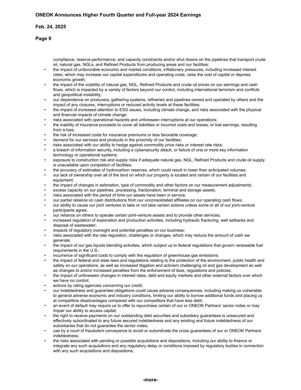 ONEOK Announces Higher Fourth Quarter and Full-year 2024 Earnings Feb. 24, 2025 Page 9 -more- compliance; reserve performance; and capacity constraints and/or shut downs on the pipelines that transport crude oil, natural gas, NGLs, and Refined Products from producing areas and our facilities; • the impact of unfavorable economic and market conditions, inflationary pressures, including increased interest rates, which may increase our capital expenditures and operating costs, raise the cost of capital or depress economic growth; • the impact of the volatility of natural gas, NGL, Refined Products and crude oil prices on our earnings and cash flows, which is impacted by a variety of factors beyond our control, including international terrorism and conflicts and geopolitical instability; • our dependence on producers, gathering systems, refineries and pipelines owned and operated by others and the impact of any closures, interruptions or reduced activity levels at these facilities; • the impact of increased attention to ESG issues, including climate change, and risks associated with the physical and financial impacts of climate change; • risks associated with operational hazards and unforeseen interruptions at our operations; • the inability of insurance proceeds to cover all liabilities or incurred costs and losses, or lost earnings, resulting from a loss; • the risk of increased costs for insurance premiums or less favorable coverage; • demand for our services and products in the proximity of our facilities; • risks associated with our ability to hedge against commodity price risks or interest rate risks; • a breach of information security, including a cybersecurity attack, or failure of one or more key information technology or operational systems; • exposure to construction risk and supply risks if adequate natural gas, NGL, Refined Products and crude oil supply is unavailable upon completion of facilities; • the accuracy of estimates of hydrocarbon reserves, which could result in lower than anticipated volumes; • our lack of ownership over all of the land on which our property is located and certain of our facilities and equipment; • the impact of changes in estimation, type of commodity and other factors on our measurement adjustments; • excess capacity on our pipelines, processing, fractionation, terminal and storage assets; • risks associated with the period of time our assets have been in service; • our partial reliance on cash distributions from our unconsolidated affiliates on our operating cash flows; • our ability to cause our joint ventures to take or not take certain actions unless some or all of our joint-venture participants agree; • our reliance on others to operate certain joint-venture assets and to provide other services; • increased regulation of exploration and production activities, including hydraulic fracturing, well setbacks and disposal of wastewater; • impacts of regulatory oversight and potential penalties on our business; • risks associated with the rate regulation, challenges or changes, which may reduce the amount of cash we generate; • the impact of our gas liquids blending activities, which subject us to federal regulations that govern renewable fuel requirements in the U.S.; • incurrence of significant costs to comply with the regulation of greenhouse gas emissions; • the impact of federal and state laws and regulations relating to the protection of the environment, public health and safety on our operations, as well as increased litigation and activism challenging oil and gas development as well as changes to and/or increased penalties from the enforcement of laws, regulations and policies; • the impact of unforeseen changes in interest rates, debt and equity markets and other external factors over which we have no control; • actions by rating agencies concerning our credit; • our indebtedness and guarantee obligations could cause adverse consequences, including making us vulnerable to general adverse economic and industry conditions, limiting our ability to borrow additional funds and placing us at competitive disadvantages compared with our competitors that have less debt; • an event of default may require us to offer to repurchase certain of our or ONEOK Partners’ senior notes or may impair our ability to access capital; • the right to receive payments on our outstanding debt securities and subsidiary guarantees is unsecured and effectively subordinated to any future secured indebtedness and any existing and future indebtedness of our subsidiaries that do not guarantee the senior notes; • use by a court of fraudulent conveyance to avoid or subordinate the cross guarantees of our or ONEOK Partners’ indebtedness; • the risks associated with pending or possible acquisitions and dispositions, including our ability to finance or integrate any such acquisitions and any regulatory delay or conditions imposed by regulatory bodies in connection with any such acquisitions and dispositions;