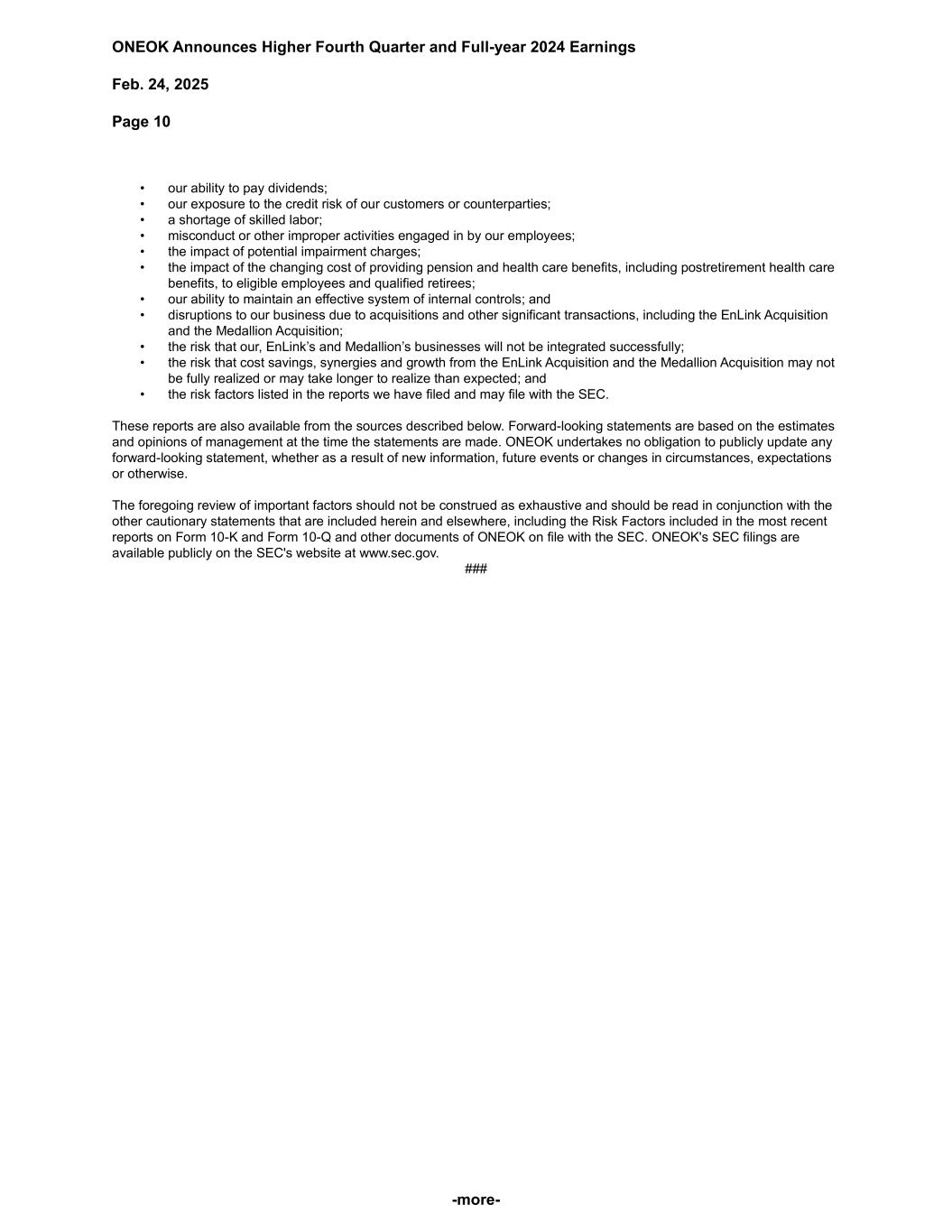 ONEOK Announces Higher Fourth Quarter and Full-year 2024 Earnings Feb. 24, 2025 Page 10 -more- • our ability to pay dividends; • our exposure to the credit risk of our customers or counterparties; • a shortage of skilled labor; • misconduct or other improper activities engaged in by our employees; • the impact of potential impairment charges; • the impact of the changing cost of providing pension and health care benefits, including postretirement health care benefits, to eligible employees and qualified retirees; • our ability to maintain an effective system of internal controls; and • disruptions to our business due to acquisitions and other significant transactions, including the EnLink Acquisition and the Medallion Acquisition; • the risk that our, EnLink’s and Medallion’s businesses will not be integrated successfully; • the risk that cost savings, synergies and growth from the EnLink Acquisition and the Medallion Acquisition may not be fully realized or may take longer to realize than expected; and • the risk factors listed in the reports we have filed and may file with the SEC. These reports are also available from the sources described below. Forward-looking statements are based on the estimates and opinions of management at the time the statements are made. ONEOK undertakes no obligation to publicly update any forward-looking statement, whether as a result of new information, future events or changes in circumstances, expectations or otherwise. The foregoing review of important factors should not be construed as exhaustive and should be read in conjunction with the other cautionary statements that are included herein and elsewhere, including the Risk Factors included in the most recent reports on Form 10-K and Form 10-Q and other documents of ONEOK on file with the SEC. ONEOK's SEC filings are available publicly on the SEC's website at www.sec.gov. ###