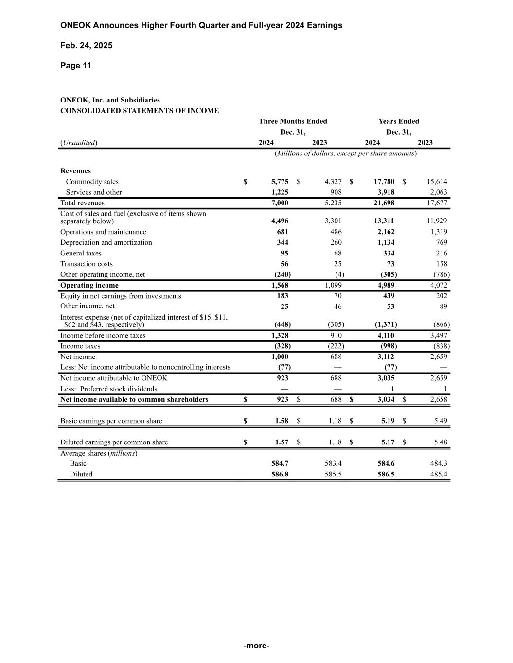 ONEOK Announces Higher Fourth Quarter and Full-year 2024 Earnings Feb. 24, 2025 Page 11 -more- ONEOK, Inc. and Subsidiaries CONSOLIDATED STATEMENTS OF INCOME Three Months Ended Years Ended Dec. 31, Dec. 31, (Unaudited) 2024 2023 2024 2023 (Millions of dollars, except per share amounts) Revenues Commodity sales $ 5,775 $ 4,327 $ 17,780 $ 15,614 Services and other 1,225 908 3,918 2,063 Total revenues 7,000 5,235 21,698 17,677 Cost of sales and fuel (exclusive of items shown separately below) 4,496 3,301 13,311 11,929 Operations and maintenance 681 486 2,162 1,319 Depreciation and amortization 344 260 1,134 769 General taxes 95 68 334 216 Transaction costs 56 25 73 158 Other operating income, net (240) (4) (305) (786) Operating income 1,568 1,099 4,989 4,072 Equity in net earnings from investments 183 70 439 202 Other income, net 25 46 53 89 Interest expense (net of capitalized interest of $15, $11, $62 and $43, respectively) (448) (305) (1,371) (866) Income before income taxes 1,328 910 4,110 3,497 Income taxes (328) (222) (998) (838) Net income 1,000 688 3,112 2,659 Less: Net income attributable to noncontrolling interests (77) — (77) — Net income attributable to ONEOK 923 688 3,035 2,659 Less: Preferred stock dividends — — 1 1 Net income available to common shareholders $ 923 $ 688 $ 3,034 $ 2,658 Basic earnings per common share $ 1.58 $ 1.18 $ 5.19 $ 5.49 Diluted earnings per common share $ 1.57 $ 1.18 $ 5.17 $ 5.48 Average shares (millions) Basic 584.7 583.4 584.6 484.3 Diluted 586.8 585.5 586.5 485.4