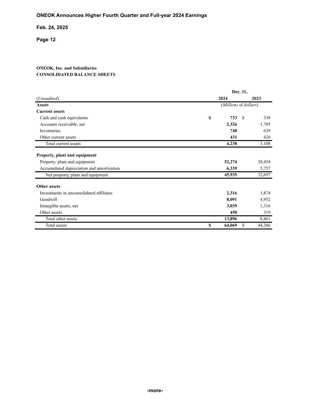ONEOK Announces Higher Fourth Quarter and Full-year 2024 Earnings Feb. 24, 2025 Page 12 -more- ONEOK, Inc. and Subsidiaries CONSOLIDATED BALANCE SHEETS Dec. 31, (Unaudited) 2024 2023 Assets (Millions of dollars) Current assets Cash and cash equivalents $ 733 $ 338 Accounts receivable, net 2,326 1,705 Inventories 748 639 Other current assets 431 426 Total current assets 4,238 3,108 Property, plant and equipment Property, plant and equipment 52,274 38,454 Accumulated depreciation and amortization 6,339 5,757 Net property, plant and equipment 45,935 32,697 Other assets Investments in unconsolidated affiliates 2,316 1,874 Goodwill 8,091 4,952 Intangible assets, net 3,039 1,316 Other assets 450 319 Total other assets 13,896 8,461 Total assets $ 64,069 $ 44,266