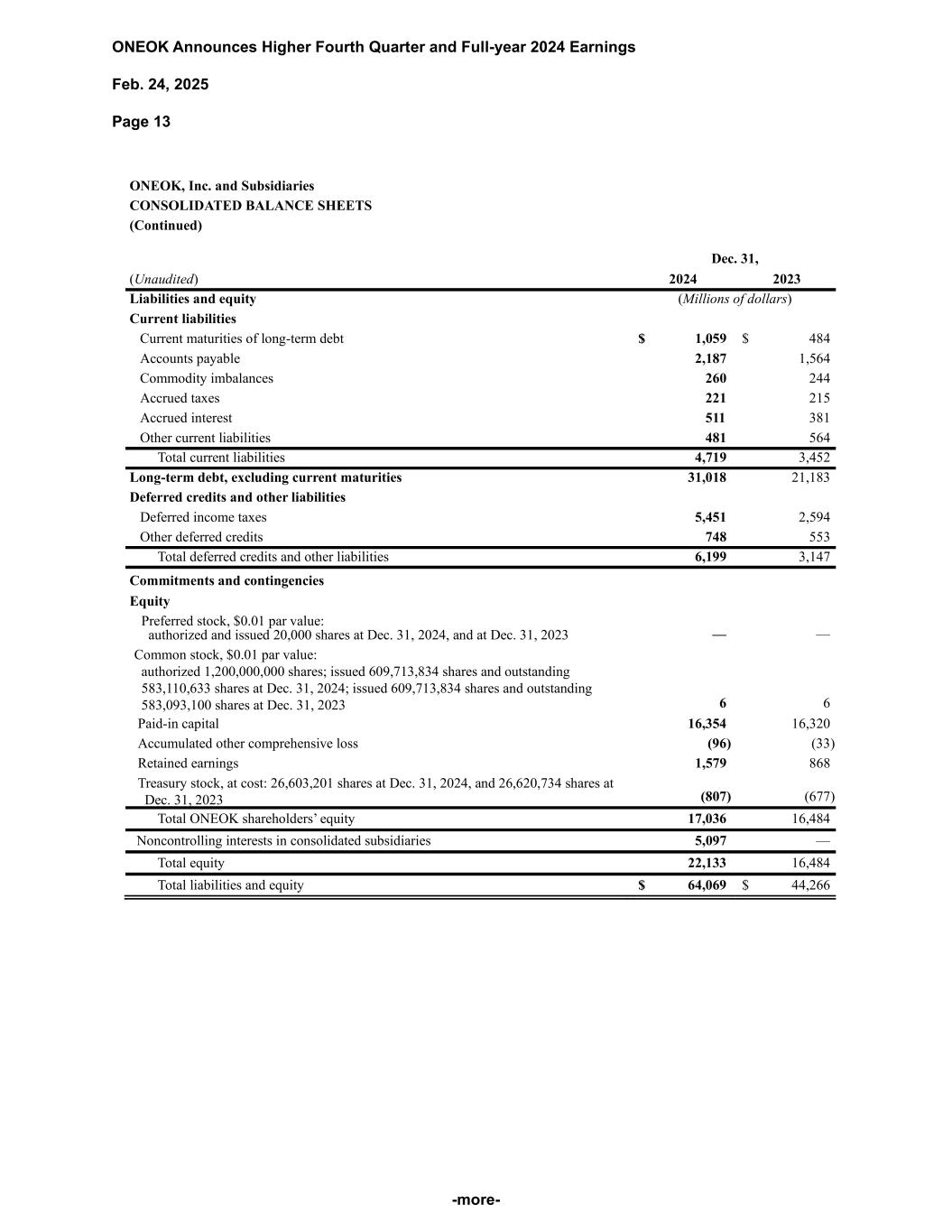ONEOK Announces Higher Fourth Quarter and Full-year 2024 Earnings Feb. 24, 2025 Page 13 -more- ONEOK, Inc. and Subsidiaries CONSOLIDATED BALANCE SHEETS (Continued) Dec. 31, (Unaudited) 2024 2023 Liabilities and equity (Millions of dollars) Current liabilities Current maturities of long-term debt $ 1,059 $ 484 Accounts payable 2,187 1,564 Commodity imbalances 260 244 Accrued taxes 221 215 Accrued interest 511 381 Other current liabilities 481 564 Total current liabilities 4,719 3,452 Long-term debt, excluding current maturities 31,018 21,183 Deferred credits and other liabilities Deferred income taxes 5,451 2,594 Other deferred credits 748 553 Total deferred credits and other liabilities 6,199 3,147 Commitments and contingencies Equity Preferred stock, $0.01 par value: authorized and issued 20,000 shares at Dec. 31, 2024, and at Dec. 31, 2023 — — Common stock, $0.01 par value: authorized 1,200,000,000 shares; issued 609,713,834 shares and outstanding 583,110,633 shares at Dec. 31, 2024; issued 609,713,834 shares and outstanding 583,093,100 shares at Dec. 31, 2023 6 6 Paid-in capital 16,354 16,320 Accumulated other comprehensive loss (96) (33) Retained earnings 1,579 868 Treasury stock, at cost: 26,603,201 shares at Dec. 31, 2024, and 26,620,734 shares at Dec. 31, 2023 (807) (677) Total ONEOK shareholders’ equity 17,036 16,484 Noncontrolling interests in consolidated subsidiaries 5,097 — Total equity 22,133 16,484 Total liabilities and equity $ 64,069 $ 44,266