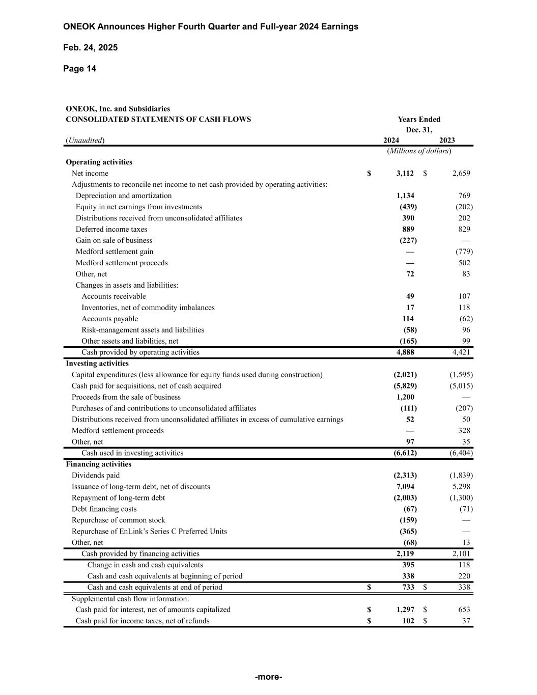ONEOK Announces Higher Fourth Quarter and Full-year 2024 Earnings Feb. 24, 2025 Page 14 -more- ONEOK, Inc. and Subsidiaries CONSOLIDATED STATEMENTS OF CASH FLOWS Years Ended Dec. 31, (Unaudited) 2024 2023 (Millions of dollars) Operating activities Net income $ 3,112 $ 2,659 Adjustments to reconcile net income to net cash provided by operating activities: Depreciation and amortization 1,134 769 Equity in net earnings from investments (439) (202) Distributions received from unconsolidated affiliates 390 202 Deferred income taxes 889 829 Gain on sale of business (227) — Medford settlement gain — (779) Medford settlement proceeds — 502 Other, net 72 83 Changes in assets and liabilities: Accounts receivable 49 107 Inventories, net of commodity imbalances 17 118 Accounts payable 114 (62) Risk-management assets and liabilities (58) 96 Other assets and liabilities, net (165) 99 Cash provided by operating activities 4,888 4,421 Investing activities Capital expenditures (less allowance for equity funds used during construction) (2,021) (1,595) Cash paid for acquisitions, net of cash acquired (5,829) (5,015) Proceeds from the sale of business 1,200 — Purchases of and contributions to unconsolidated affiliates (111) (207) Distributions received from unconsolidated affiliates in excess of cumulative earnings 52 50 Medford settlement proceeds — 328 Other, net 97 35 Cash used in investing activities (6,612) (6,404) Financing activities Dividends paid (2,313) (1,839) Issuance of long-term debt, net of discounts 7,094 5,298 Repayment of long-term debt (2,003) (1,300) Debt financing costs (67) (71) Repurchase of common stock (159) — Repurchase of EnLink’s Series C Preferred Units (365) — Other, net (68) 13 Cash provided by financing activities 2,119 2,101 Change in cash and cash equivalents 395 118 Cash and cash equivalents at beginning of period 338 220 Cash and cash equivalents at end of period $ 733 $ 338 Supplemental cash flow information: Cash paid for interest, net of amounts capitalized $ 1,297 $ 653 Cash paid for income taxes, net of refunds $ 102 $ 37