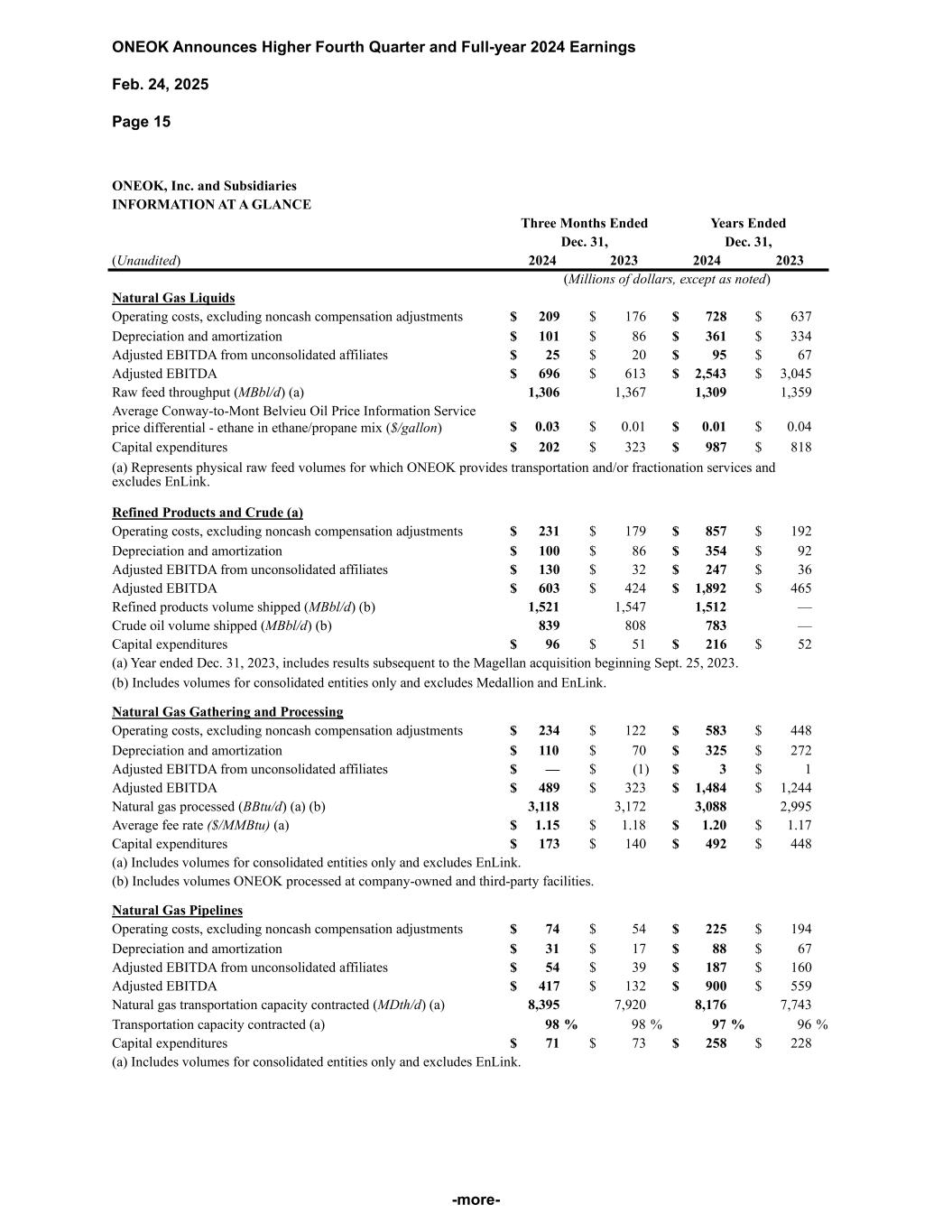 ONEOK Announces Higher Fourth Quarter and Full-year 2024 Earnings Feb. 24, 2025 Page 15 -more- ONEOK, Inc. and Subsidiaries INFORMATION AT A GLANCE Three Months Ended Years Ended Dec. 31, Dec. 31, (Unaudited) 2024 2023 2024 2023 (Millions of dollars, except as noted) Natural Gas Liquids Operating costs, excluding noncash compensation adjustments $ 209 $ 176 $ 728 $ 637 Depreciation and amortization $ 101 $ 86 $ 361 $ 334 Adjusted EBITDA from unconsolidated affiliates $ 25 $ 20 $ 95 $ 67 Adjusted EBITDA $ 696 $ 613 $ 2,543 $ 3,045 Raw feed throughput (MBbl/d) (a) 1,306 1,367 1,309 1,359 Average Conway-to-Mont Belvieu Oil Price Information Service price differential - ethane in ethane/propane mix ($/gallon) $ 0.03 $ 0.01 $ 0.01 $ 0.04 Capital expenditures $ 202 $ 323 $ 987 $ 818 (a) Represents physical raw feed volumes for which ONEOK provides transportation and/or fractionation services and excludes EnLink. Refined Products and Crude (a) Operating costs, excluding noncash compensation adjustments $ 231 $ 179 $ 857 $ 192 Depreciation and amortization $ 100 $ 86 $ 354 $ 92 Adjusted EBITDA from unconsolidated affiliates $ 130 $ 32 $ 247 $ 36 Adjusted EBITDA $ 603 $ 424 $ 1,892 $ 465 Refined products volume shipped (MBbl/d) (b) 1,521 1,547 1,512 — Crude oil volume shipped (MBbl/d) (b) 839 808 783 — Capital expenditures $ 96 $ 51 $ 216 $ 52 (a) Year ended Dec. 31, 2023, includes results subsequent to the Magellan acquisition beginning Sept. 25, 2023. (b) Includes volumes for consolidated entities only and excludes Medallion and EnLink. Natural Gas Gathering and Processing Operating costs, excluding noncash compensation adjustments $ 234 $ 122 $ 583 $ 448 Depreciation and amortization $ 110 $ 70 $ 325 $ 272 Adjusted EBITDA from unconsolidated affiliates $ — $ (1) $ 3 $ 1 Adjusted EBITDA $ 489 $ 323 $ 1,484 $ 1,244 Natural gas processed (BBtu/d) (a) (b) 3,118 3,172 3,088 2,995 Average fee rate ($/MMBtu) (a) $ 1.15 $ 1.18 $ 1.20 $ 1.17 Capital expenditures $ 173 $ 140 $ 492 $ 448 (a) Includes volumes for consolidated entities only and excludes EnLink. (b) Includes volumes ONEOK processed at company-owned and third-party facilities. Natural Gas Pipelines Operating costs, excluding noncash compensation adjustments $ 74 $ 54 $ 225 $ 194 Depreciation and amortization $ 31 $ 17 $ 88 $ 67 Adjusted EBITDA from unconsolidated affiliates $ 54 $ 39 $ 187 $ 160 Adjusted EBITDA $ 417 $ 132 $ 900 $ 559 Natural gas transportation capacity contracted (MDth/d) (a) 8,395 7,920 8,176 7,743 Transportation capacity contracted (a) 98 % 98 % 97 % 96 % Capital expenditures $ 71 $ 73 $ 258 $ 228 (a) Includes volumes for consolidated entities only and excludes EnLink.