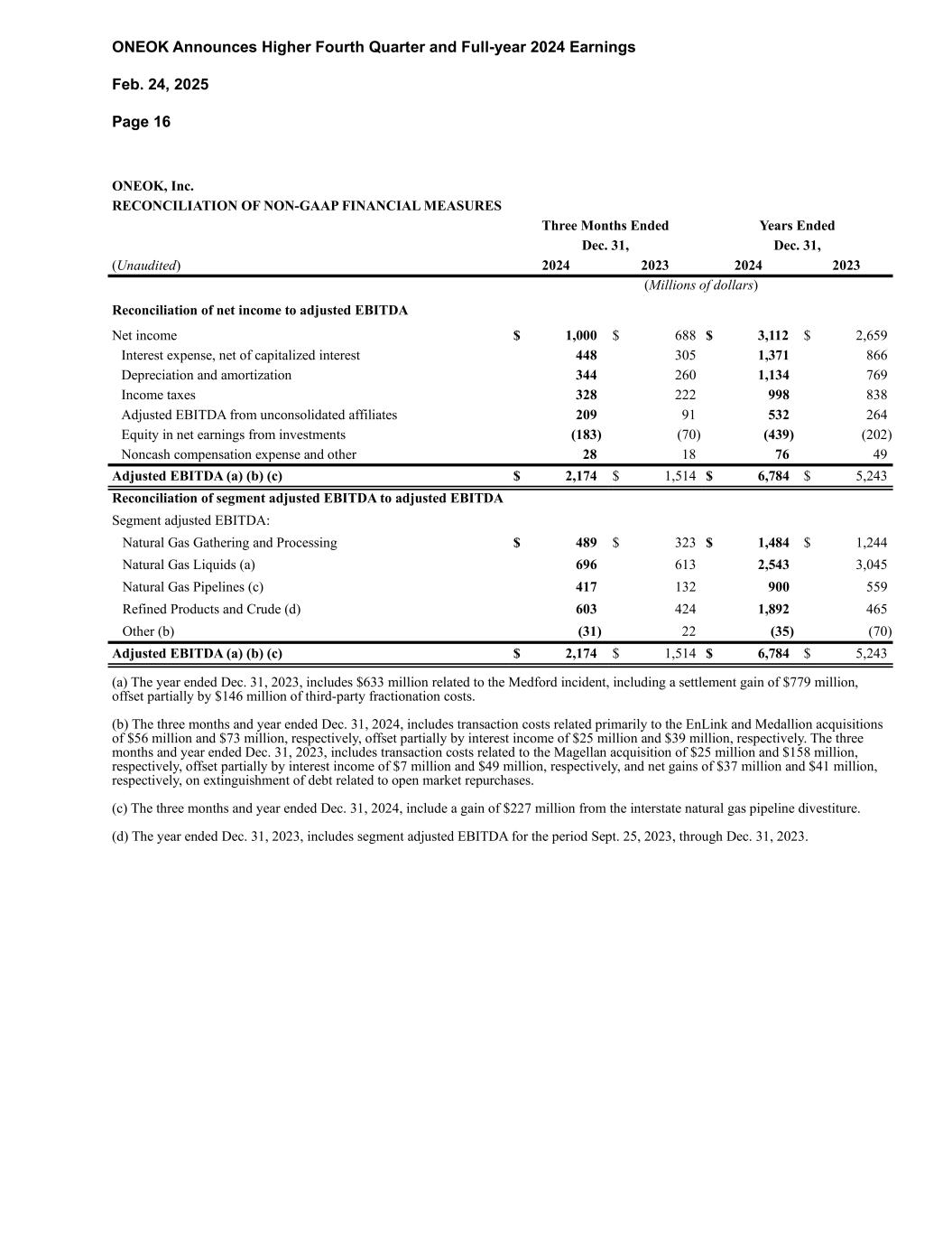 ONEOK Announces Higher Fourth Quarter and Full-year 2024 Earnings Feb. 24, 2025 Page 16 -more- ONEOK, Inc. RECONCILIATION OF NON-GAAP FINANCIAL MEASURES Three Months Ended Years Ended Dec. 31, Dec. 31, (Unaudited) 2024 2023 2024 2023 (Millions of dollars) Reconciliation of net income to adjusted EBITDA Net income $ 1,000 $ 688 $ 3,112 $ 2,659 Interest expense, net of capitalized interest 448 305 1,371 866 Depreciation and amortization 344 260 1,134 769 Income taxes 328 222 998 838 Adjusted EBITDA from unconsolidated affiliates 209 91 532 264 Equity in net earnings from investments (183) (70) (439) (202) Noncash compensation expense and other 28 18 76 49 Adjusted EBITDA (a) (b) (c) $ 2,174 $ 1,514 $ 6,784 $ 5,243 Reconciliation of segment adjusted EBITDA to adjusted EBITDA Segment adjusted EBITDA: Natural Gas Gathering and Processing $ 489 $ 323 $ 1,484 $ 1,244 Natural Gas Liquids (a) 696 613 2,543 3,045 Natural Gas Pipelines (c) 417 132 900 559 Refined Products and Crude (d) 603 424 1,892 465 Other (b) (31) 22 (35) (70) Adjusted EBITDA (a) (b) (c) $ 2,174 $ 1,514 $ 6,784 $ 5,243 (a) The year ended Dec. 31, 2023, includes $633 million related to the Medford incident, including a settlement gain of $779 million, offset partially by $146 million of third-party fractionation costs. (b) The three months and year ended Dec. 31, 2024, includes transaction costs related primarily to the EnLink and Medallion acquisitions of $56 million and $73 million, respectively, offset partially by interest income of $25 million and $39 million, respectively. The three months and year ended Dec. 31, 2023, includes transaction costs related to the Magellan acquisition of $25 million and $158 million, respectively, offset partially by interest income of $7 million and $49 million, respectively, and net gains of $37 million and $41 million, respectively, on extinguishment of debt related to open market repurchases. (c) The three months and year ended Dec. 31, 2024, include a gain of $227 million from the interstate natural gas pipeline divestiture. (d) The year ended Dec. 31, 2023, includes segment adjusted EBITDA for the period Sept. 25, 2023, through Dec. 31, 2023.