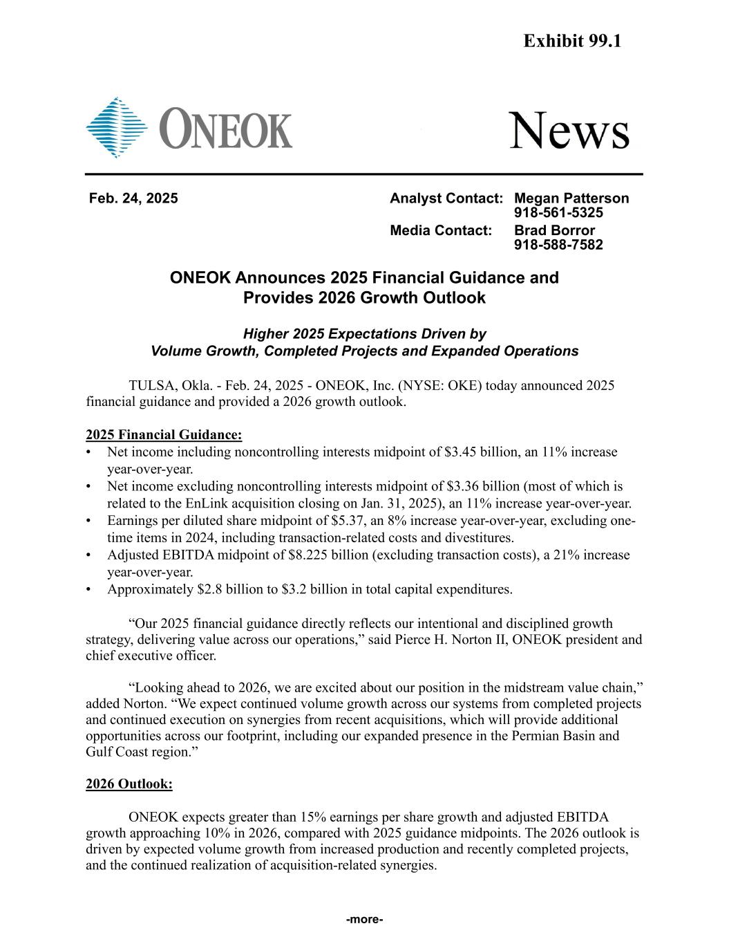 -more- Feb. 24, 2025 Analyst Contact: Megan Patterson 918-561-5325 Media Contact: Brad Borror 918-588-7582 ONEOK Announces 2025 Financial Guidance and Provides 2026 Growth Outlook Higher 2025 Expectations Driven by Volume Growth, Completed Projects and Expanded Operations TULSA, Okla. - Feb. 24, 2025 - ONEOK, Inc. (NYSE: OKE) today announced 2025 financial guidance and provided a 2026 growth outlook. 2025 Financial Guidance: • Net income including noncontrolling interests midpoint of $3.45 billion, an 11% increase year-over-year. • Net income excluding noncontrolling interests midpoint of $3.36 billion (most of which is related to the EnLink acquisition closing on Jan. 31, 2025), an 11% increase year-over-year. • Earnings per diluted share midpoint of $5.37, an 8% increase year-over-year, excluding one- time items in 2024, including transaction-related costs and divestitures. • Adjusted EBITDA midpoint of $8.225 billion (excluding transaction costs), a 21% increase year-over-year. • Approximately $2.8 billion to $3.2 billion in total capital expenditures. “Our 2025 financial guidance directly reflects our intentional and disciplined growth strategy, delivering value across our operations,” said Pierce H. Norton II, ONEOK president and chief executive officer. “Looking ahead to 2026, we are excited about our position in the midstream value chain,” added Norton. “We expect continued volume growth across our systems from completed projects and continued execution on synergies from recent acquisitions, which will provide additional opportunities across our footprint, including our expanded presence in the Permian Basin and Gulf Coast region.” 2026 Outlook: ONEOK expects greater than 15% earnings per share growth and adjusted EBITDA growth approaching 10% in 2026, compared with 2025 guidance midpoints. The 2026 outlook is driven by expected volume growth from increased production and recently completed projects, and the continued realization of acquisition-related synergies. Exhibit 99.1