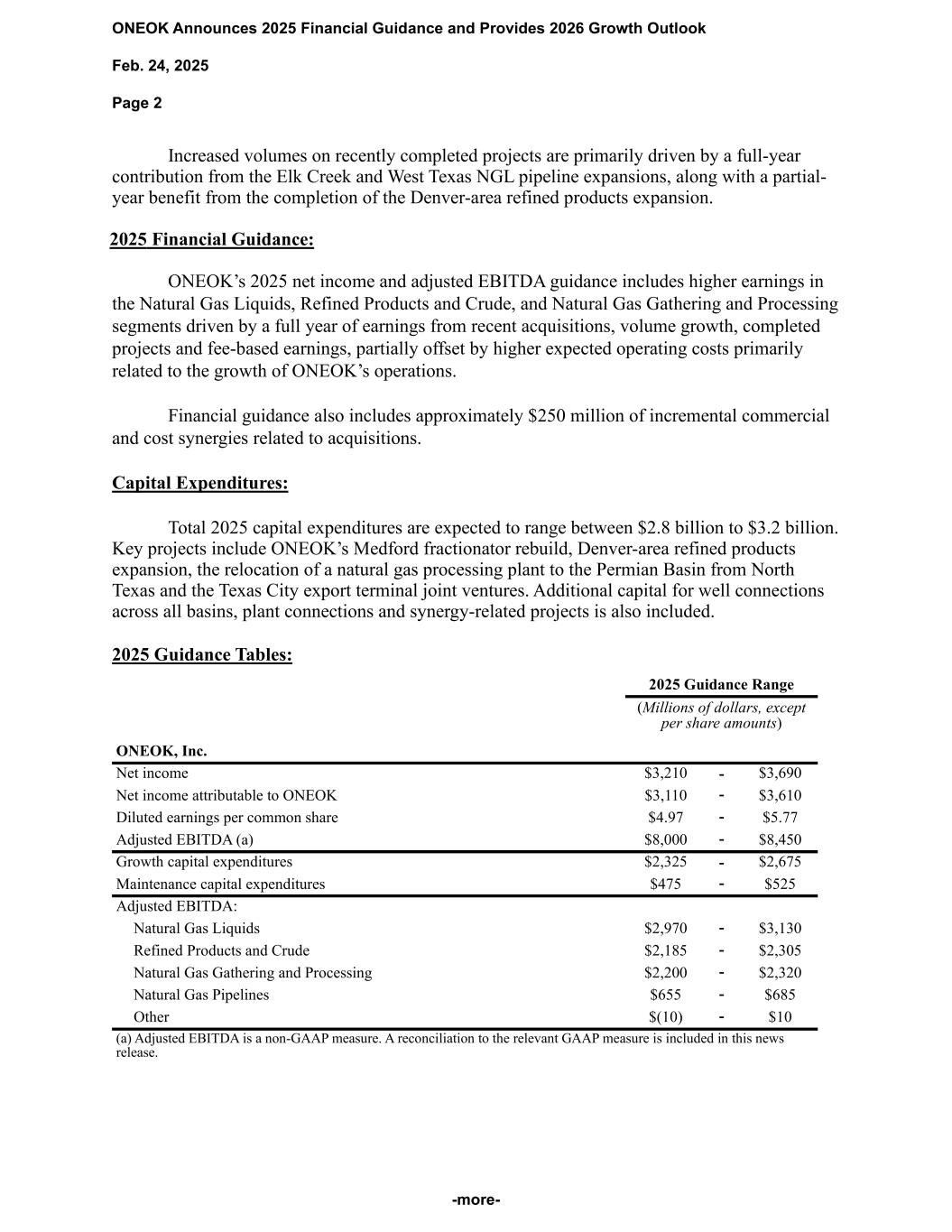 ONEOK Announces 2025 Financial Guidance and Provides 2026 Growth Outlook Feb. 24, 2025 Page 2 -more- Increased volumes on recently completed projects are primarily driven by a full-year contribution from the Elk Creek and West Texas NGL pipeline expansions, along with a partial- year benefit from the completion of the Denver-area refined products expansion. 2025 Financial Guidance: ONEOK’s 2025 net income and adjusted EBITDA guidance includes higher earnings in the Natural Gas Liquids, Refined Products and Crude, and Natural Gas Gathering and Processing segments driven by a full year of earnings from recent acquisitions, volume growth, completed projects and fee-based earnings, partially offset by higher expected operating costs primarily related to the growth of ONEOK’s operations. Financial guidance also includes approximately $250 million of incremental commercial and cost synergies related to acquisitions. Capital Expenditures: Total 2025 capital expenditures are expected to range between $2.8 billion to $3.2 billion. Key projects include ONEOK’s Medford fractionator rebuild, Denver-area refined products expansion, the relocation of a natural gas processing plant to the Permian Basin from North Texas and the Texas City export terminal joint ventures. Additional capital for well connections across all basins, plant connections and synergy-related projects is also included. 2025 Guidance Tables: 2025 Guidance Range (Millions of dollars, except per share amounts) ONEOK, Inc. Net income $3,210 - $3,690 Net income attributable to ONEOK $3,110 - $3,610 Diluted earnings per common share $4.97 - $5.77 Adjusted EBITDA (a) $8,000 - $8,450 Growth capital expenditures $2,325 - $2,675 Maintenance capital expenditures $475 - $525 Adjusted EBITDA: Natural Gas Liquids $2,970 - $3,130 Refined Products and Crude $2,185 - $2,305 Natural Gas Gathering and Processing $2,200 - $2,320 Natural Gas Pipelines $655 - $685 Other $(10) - $10 (a) Adjusted EBITDA is a non-GAAP measure. A reconciliation to the relevant GAAP measure is included in this news release.