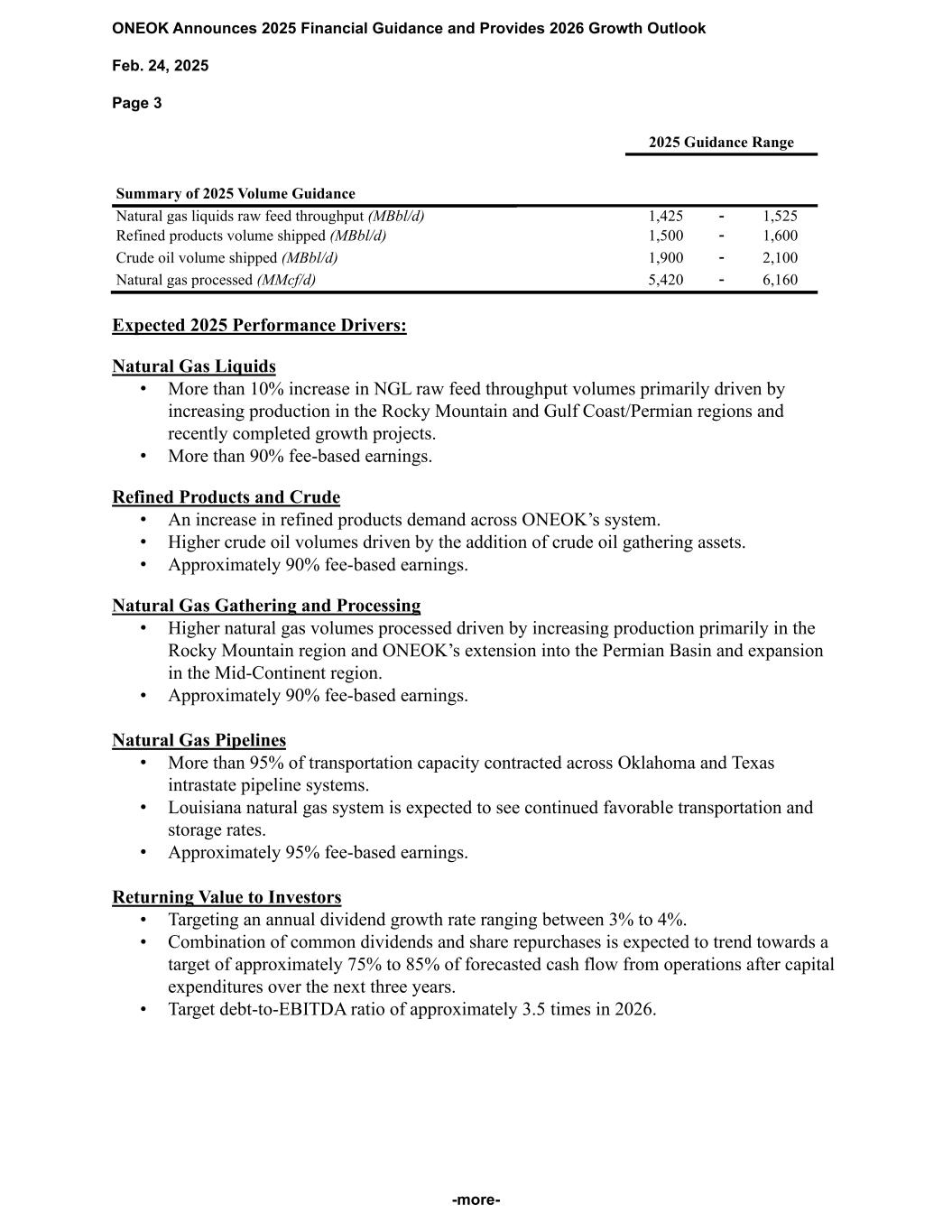ONEOK Announces 2025 Financial Guidance and Provides 2026 Growth Outlook Feb. 24, 2025 Page 3 -more- 2025 Guidance Range Summary of 2025 Volume Guidance Natural gas liquids raw feed throughput (MBbl/d) 1,425 - 1,525 Refined products volume shipped (MBbl/d) 1,500 - 1,600 Crude oil volume shipped (MBbl/d) 1,900 - 2,100 Natural gas processed (MMcf/d) 5,420 - 6,160 Expected 2025 Performance Drivers: Natural Gas Liquids • More than 10% increase in NGL raw feed throughput volumes primarily driven by increasing production in the Rocky Mountain and Gulf Coast/Permian regions and recently completed growth projects. • More than 90% fee-based earnings. Refined Products and Crude • An increase in refined products demand across ONEOK’s system. • Higher crude oil volumes driven by the addition of crude oil gathering assets. • Approximately 90% fee-based earnings. Natural Gas Gathering and Processing • Higher natural gas volumes processed driven by increasing production primarily in the Rocky Mountain region and ONEOK’s extension into the Permian Basin and expansion in the Mid-Continent region. • Approximately 90% fee-based earnings. Natural Gas Pipelines • More than 95% of transportation capacity contracted across Oklahoma and Texas intrastate pipeline systems. • Louisiana natural gas system is expected to see continued favorable transportation and storage rates. • Approximately 95% fee-based earnings. Returning Value to Investors • Targeting an annual dividend growth rate ranging between 3% to 4%. • Combination of common dividends and share repurchases is expected to trend towards a target of approximately 75% to 85% of forecasted cash flow from operations after capital expenditures over the next three years. • Target debt-to-EBITDA ratio of approximately 3.5 times in 2026.
