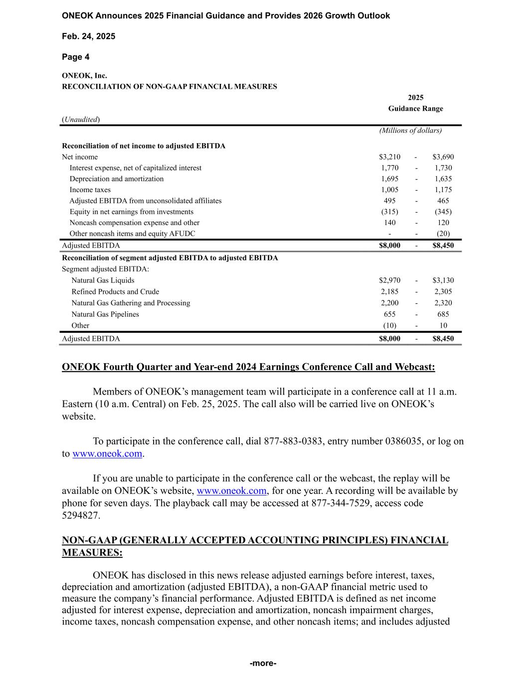 ONEOK Announces 2025 Financial Guidance and Provides 2026 Growth Outlook Feb. 24, 2025 Page 4 -more- ONEOK, Inc. RECONCILIATION OF NON-GAAP FINANCIAL MEASURES 2025 Guidance Range (Unaudited) (Millions of dollars) Reconciliation of net income to adjusted EBITDA Net income $3,210 - $3,690 Interest expense, net of capitalized interest 1,770 - 1,730 Depreciation and amortization 1,695 - 1,635 Income taxes 1,005 - 1,175 Adjusted EBITDA from unconsolidated affiliates 495 - 465 Equity in net earnings from investments (315) - (345) Noncash compensation expense and other 140 - 120 Other noncash items and equity AFUDC - - (20) Adjusted EBITDA $8,000 - $8,450 Reconciliation of segment adjusted EBITDA to adjusted EBITDA Segment adjusted EBITDA: Natural Gas Liquids $2,970 - $3,130 Refined Products and Crude 2,185 - 2,305 Natural Gas Gathering and Processing 2,200 - 2,320 Natural Gas Pipelines 655 - 685 Other (10) - 10 Adjusted EBITDA $8,000 - $8,450 ONEOK Fourth Quarter and Year-end 2024 Earnings Conference Call and Webcast: Members of ONEOK’s management team will participate in a conference call at 11 a.m. Eastern (10 a.m. Central) on Feb. 25, 2025. The call also will be carried live on ONEOK’s website. To participate in the conference call, dial 877-883-0383, entry number 0386035, or log on to www.oneok.com. If you are unable to participate in the conference call or the webcast, the replay will be available on ONEOK’s website, www.oneok.com, for one year. A recording will be available by phone for seven days. The playback call may be accessed at 877-344-7529, access code 5294827. NON-GAAP (GENERALLY ACCEPTED ACCOUNTING PRINCIPLES) FINANCIAL MEASURES: ONEOK has disclosed in this news release adjusted earnings before interest, taxes, depreciation and amortization (adjusted EBITDA), a non-GAAP financial metric used to measure the company’s financial performance. Adjusted EBITDA is defined as net income adjusted for interest expense, depreciation and amortization, noncash impairment charges, income taxes, noncash compensation expense, and other noncash items; and includes adjusted