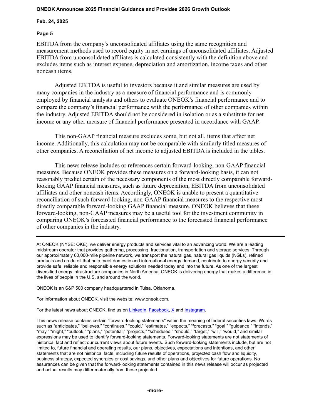 ONEOK Announces 2025 Financial Guidance and Provides 2026 Growth Outlook Feb. 24, 2025 Page 5 -more- EBITDA from the company’s unconsolidated affiliates using the same recognition and measurement methods used to record equity in net earnings of unconsolidated affiliates. Adjusted EBITDA from unconsolidated affiliates is calculated consistently with the definition above and excludes items such as interest expense, depreciation and amortization, income taxes and other noncash items. Adjusted EBITDA is useful to investors because it and similar measures are used by many companies in the industry as a measure of financial performance and is commonly employed by financial analysts and others to evaluate ONEOK’s financial performance and to compare the company’s financial performance with the performance of other companies within the industry. Adjusted EBITDA should not be considered in isolation or as a substitute for net income or any other measure of financial performance presented in accordance with GAAP. This non-GAAP financial measure excludes some, but not all, items that affect net income. Additionally, this calculation may not be comparable with similarly titled measures of other companies. A reconciliation of net income to adjusted EBITDA is included in the tables. This news release includes or references certain forward-looking, non-GAAP financial measures. Because ONEOK provides these measures on a forward-looking basis, it can not reasonably predict certain of the necessary components of the most directly comparable forward- looking GAAP financial measures, such as future depreciation, EBITDA from unconsolidated affiliates and other noncash items. Accordingly, ONEOK is unable to present a quantitative reconciliation of such forward-looking, non-GAAP financial measures to the respective most directly comparable forward-looking GAAP financial measure. ONEOK believes that these forward-looking, non-GAAP measures may be a useful tool for the investment community in comparing ONEOK’s forecasted financial performance to the forecasted financial performance of other companies in the industry. At ONEOK (NYSE: OKE), we deliver energy products and services vital to an advancing world. We are a leading midstream operator that provides gathering, processing, fractionation, transportation and storage services. Through our approximately 60,000-mile pipeline network, we transport the natural gas, natural gas liquids (NGLs), refined products and crude oil that help meet domestic and international energy demand, contribute to energy security and provide safe, reliable and responsible energy solutions needed today and into the future. As one of the largest diversified energy infrastructure companies in North America, ONEOK is delivering energy that makes a difference in the lives of people in the U.S. and around the world. ONEOK is an S&P 500 company headquartered in Tulsa, Oklahoma. For information about ONEOK, visit the website: www.oneok.com. For the latest news about ONEOK, find us on LinkedIn, Facebook, X and Instagram. This news release contains certain "forward-looking statements" within the meaning of federal securities laws. Words such as “anticipates,” “believes,” “continues,” “could,” “estimates,” “expects,” “forecasts,” “goal,” “guidance,” “intends,” “may,” “might,” “outlook,” “plans,” “potential,” “projects,” “scheduled,” “should,” “target,” “will,” “would,” and similar expressions may be used to identify forward-looking statements. Forward-looking statements are not statements of historical fact and reflect our current views about future events. Such forward-looking statements include, but are not limited to, future financial and operating results, our plans, objectives, expectations and intentions, and other statements that are not historical facts, including future results of operations, projected cash flow and liquidity, business strategy, expected synergies or cost savings, and other plans and objectives for future operations. No assurances can be given that the forward-looking statements contained in this news release will occur as projected and actual results may differ materially from those projected.