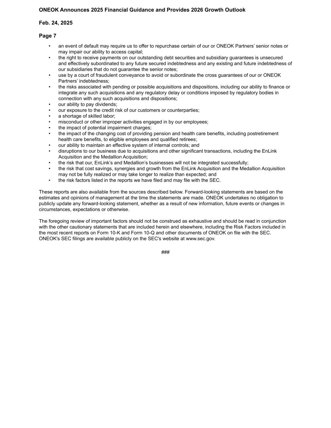 ONEOK Announces 2025 Financial Guidance and Provides 2026 Growth Outlook Feb. 24, 2025 Page 7 -more- • an event of default may require us to offer to repurchase certain of our or ONEOK Partners’ senior notes or may impair our ability to access capital; • the right to receive payments on our outstanding debt securities and subsidiary guarantees is unsecured and effectively subordinated to any future secured indebtedness and any existing and future indebtedness of our subsidiaries that do not guarantee the senior notes; • use by a court of fraudulent conveyance to avoid or subordinate the cross guarantees of our or ONEOK Partners’ indebtedness; • the risks associated with pending or possible acquisitions and dispositions, including our ability to finance or integrate any such acquisitions and any regulatory delay or conditions imposed by regulatory bodies in connection with any such acquisitions and dispositions; • our ability to pay dividends; • our exposure to the credit risk of our customers or counterparties; • a shortage of skilled labor; • misconduct or other improper activities engaged in by our employees; • the impact of potential impairment charges; • the impact of the changing cost of providing pension and health care benefits, including postretirement health care benefits, to eligible employees and qualified retirees; • our ability to maintain an effective system of internal controls; and • disruptions to our business due to acquisitions and other significant transactions, including the EnLink Acquisition and the Medallion Acquisition; • the risk that our, EnLink’s and Medallion’s businesses will not be integrated successfully; • the risk that cost savings, synergies and growth from the EnLink Acquisition and the Medallion Acquisition may not be fully realized or may take longer to realize than expected; and • the risk factors listed in the reports we have filed and may file with the SEC. These reports are also available from the sources described below. Forward-looking statements are based on the estimates and opinions of management at the time the statements are made. ONEOK undertakes no obligation to publicly update any forward-looking statement, whether as a result of new information, future events or changes in circumstances, expectations or otherwise. The foregoing review of important factors should not be construed as exhaustive and should be read in conjunction with the other cautionary statements that are included herein and elsewhere, including the Risk Factors included in the most recent reports on Form 10-K and Form 10-Q and other documents of ONEOK on file with the SEC. ONEOK's SEC filings are available publicly on the SEC's website at www.sec.gov. ###