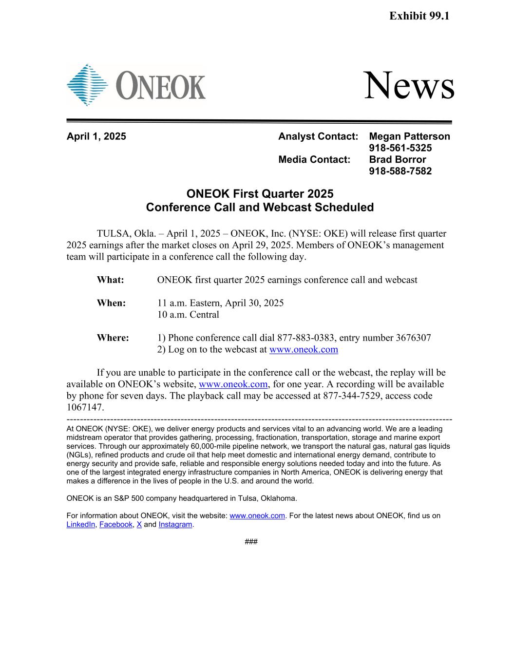 News ONEOK First Quarter 2025 Conference Call and Webcast Scheduled TULSA, Okla. – April 1, 2025 – ONEOK, Inc. (NYSE: OKE) will release first quarter 2025 earnings after the market closes on April 29, 2025. Members of ONEOK’s management team will participate in a conference call the following day. What: ONEOK first quarter 2025 earnings conference call and webcast When: 11 a.m. Eastern, April 30, 2025 10 a.m. Central Where: 1) Phone conference call dial 877-883-0383, entry number 3676307 2) Log on to the webcast at www.oneok.com If you are unable to participate in the conference call or the webcast, the replay will be available on ONEOK’s website, www.oneok.com, for one year. A recording will be available by phone for seven days. The playback call may be accessed at 877-344-7529, access code 1067147. ------------------------------------------------------------------------------------------------------------------- At ONEOK (NYSE: OKE), we deliver energy products and services vital to an advancing world. We are a leading midstream operator that provides gathering, processing, fractionation, transportation, storage and marine export services. Through our approximately 60,000-mile pipeline network, we transport the natural gas, natural gas liquids (NGLs), refined products and crude oil that help meet domestic and international energy demand, contribute to energy security and provide safe, reliable and responsible energy solutions needed today and into the future. As one of the largest integrated energy infrastructure companies in North America, ONEOK is delivering energy that makes a difference in the lives of people in the U.S. and around the world. ONEOK is an S&P 500 company headquartered in Tulsa, Oklahoma. For information about ONEOK, visit the website: www.oneok.com. For the latest news about ONEOK, find us on LinkedIn, Facebook, X and Instagram. ### April 1, 2025 Analyst Contact: Megan Patterson 918-561-5325 Media Contact: Brad Borror 918-588-7582 Exhibit 99.1