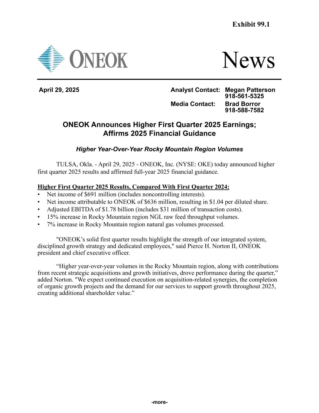 -more- April 29, 2025 Analyst Contact: Megan Patterson 918-561-5325 Media Contact: Brad Borror 918-588-7582 ONEOK Announces Higher First Quarter 2025 Earnings; Affirms 2025 Financial Guidance Higher Year-Over-Year Rocky Mountain Region Volumes TULSA, Okla. - April 29, 2025 - ONEOK, Inc. (NYSE: OKE) today announced higher first quarter 2025 results and affirmed full-year 2025 financial guidance. Higher First Quarter 2025 Results, Compared With First Quarter 2024: • Net income of $691 million (includes noncontrolling interests). • Net income attributable to ONEOK of $636 million, resulting in $1.04 per diluted share. • Adjusted EBITDA of $1.78 billion (includes $31 million of transaction costs). • 15% increase in Rocky Mountain region NGL raw feed throughput volumes. • 7% increase in Rocky Mountain region natural gas volumes processed. "ONEOK’s solid first quarter results highlight the strength of our integrated system, disciplined growth strategy and dedicated employees," said Pierce H. Norton II, ONEOK president and chief executive officer. “Higher year-over-year volumes in the Rocky Mountain region, along with contributions from recent strategic acquisitions and growth initiatives, drove performance during the quarter,” added Norton. "We expect continued execution on acquisition-related synergies, the completion of organic growth projects and the demand for our services to support growth throughout 2025, creating additional shareholder value.” Exhibit 99.1