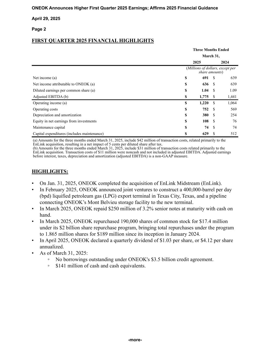 ONEOK Announces Higher First Quarter 2025 Earnings; Affirms 2025 Financial Guidance April 29, 2025 Page 2 -more- FIRST QUARTER 2025 FINANCIAL HIGHLIGHTS Three Months Ended March 31, 2025 2024 (Millions of dollars, except per share amounts) Net income (a) $ 691 $ 639 Net income attributable to ONEOK (a) $ 636 $ 639 Diluted earnings per common share (a) $ 1.04 $ 1.09 Adjusted EBITDA (b) $ 1,775 $ 1,441 Operating income (a) $ 1,220 $ 1,064 Operating costs $ 752 $ 569 Depreciation and amortization $ 380 $ 254 Equity in net earnings from investments $ 108 $ 76 Maintenance capital $ 74 $ 74 Capital expenditures (includes maintenance) $ 629 $ 512 (a) Amounts for the three months ended March 31, 2025, include $42 million of transaction costs, related primarily to the EnLink acquisition, resulting in a net impact of 5 cents per diluted share after tax. (b) Amounts for the three months ended March 31, 2025, include $31 million of transaction costs related primarily to the EnLink acquisition. Transaction costs of $11 million were noncash and not included in adjusted EBITDA. Adjusted earnings before interest, taxes, depreciation and amortization (adjusted EBITDA) is a non-GAAP measure. HIGHLIGHTS: • On Jan. 31, 2025, ONEOK completed the acquisition of EnLink Midstream (EnLink). • In February 2025, ONEOK announced joint ventures to construct a 400,000-barrel per day (bpd) liquified petroleum gas (LPG) export terminal in Texas City, Texas, and a pipeline connecting ONEOK’s Mont Belvieu storage facility to the new terminal. • In March 2025, ONEOK repaid $250 million of 3.2% senior notes at maturity with cash on hand. • In March 2025, ONEOK repurchased 190,000 shares of common stock for $17.4 million under its $2 billion share repurchase program, bringing total repurchases under the program to 1.865 million shares for $189 million since its inception in January 2024. • In April 2025, ONEOK declared a quarterly dividend of $1.03 per share, or $4.12 per share annualized. • As of March 31, 2025: ◦ No borrowings outstanding under ONEOK's $3.5 billion credit agreement. ◦ $141 million of cash and cash equivalents.
